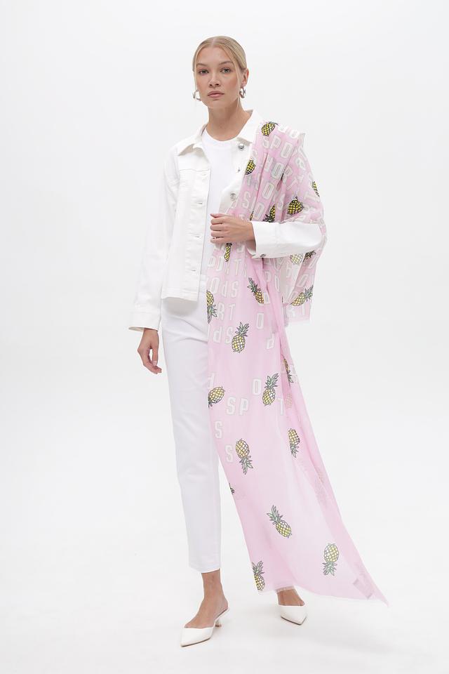 Этот шарф от Marc Cain – прекрасное дополнение к вашему гардеробу. Выполнен в нежном розовом цвете и украшен оригинальным принтом с изображением ананасов и буквенными элементами.