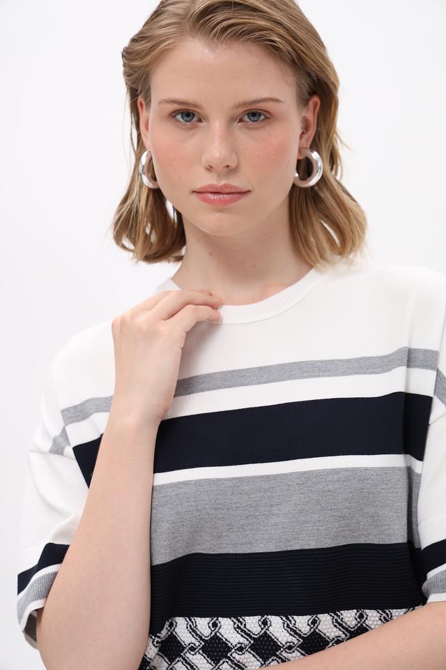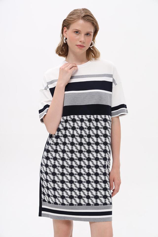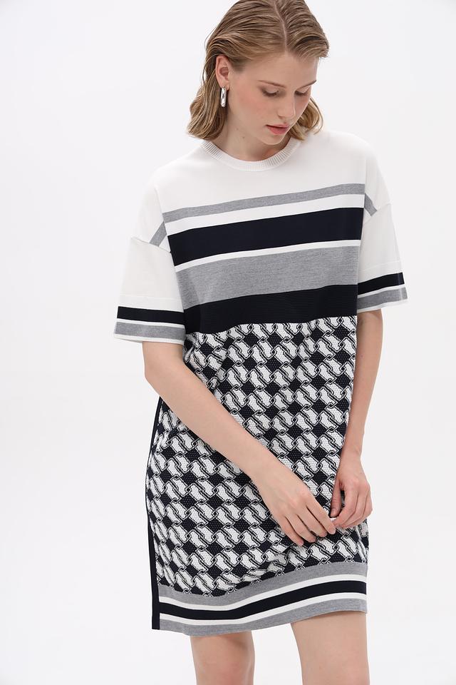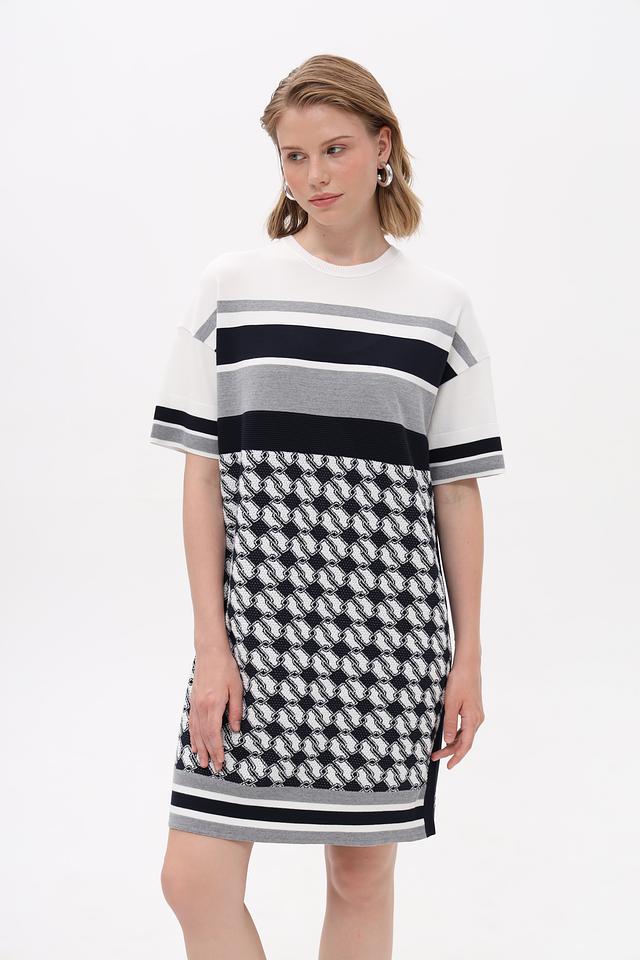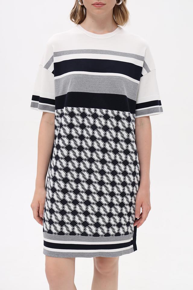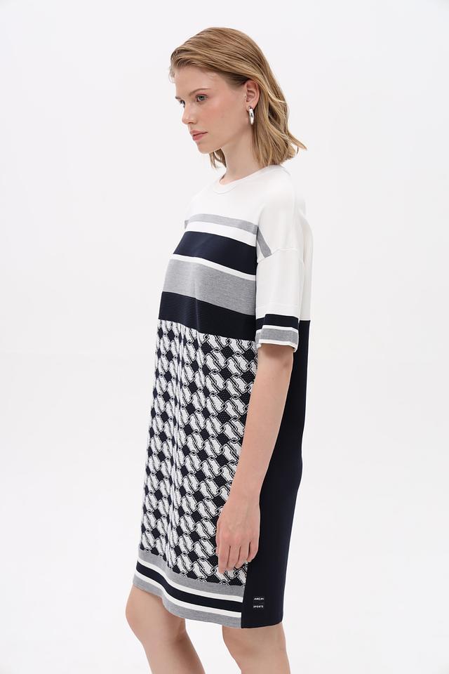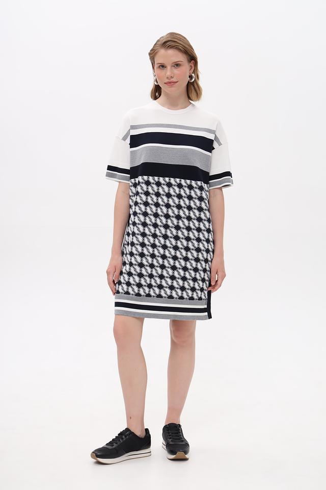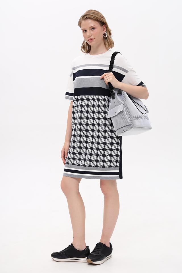 Это стильное платье от Marc Cain Sports станет отличным дополнением к вашему гардеробу. Верх платья выполнен в полоску – сочетание белого, серого и синего цветов. Нижняя часть платья украшена оригинальным принтом в чёрно-белой гамме.