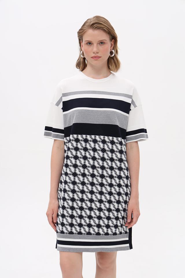Платье имеет прямой, слегка свободный крой, который обеспечивает комфорт при ношении. Короткие рукава делают его идеальным для тёплой погоды. Круглый вырез горловины классической формы.