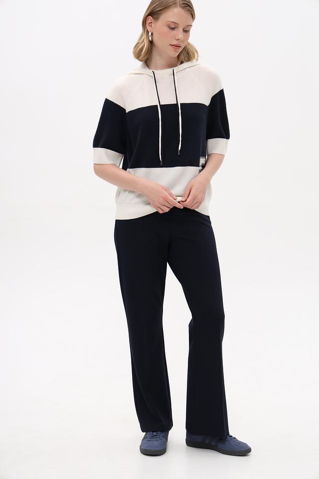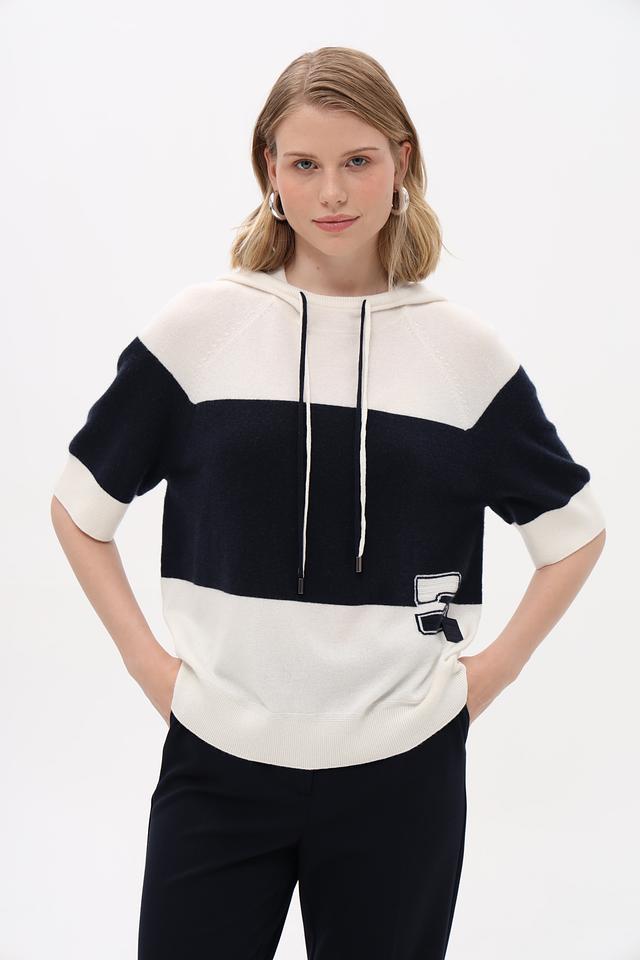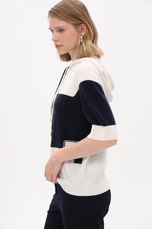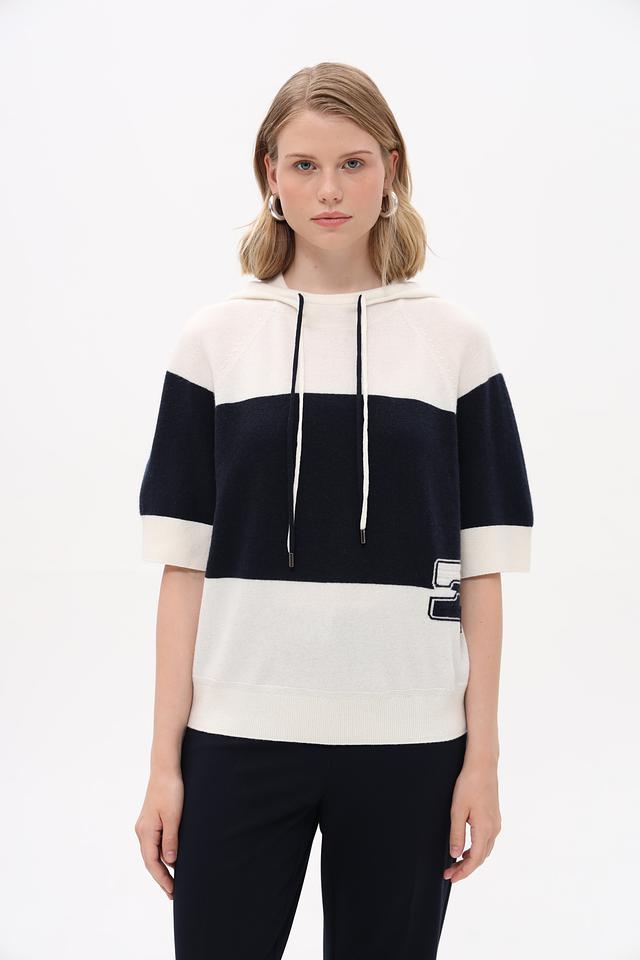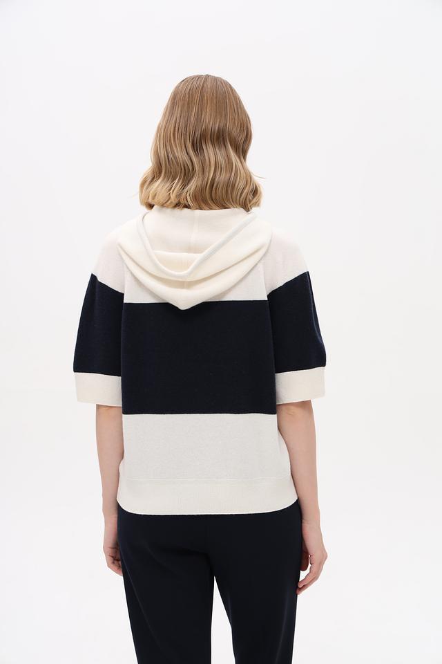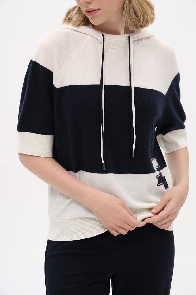 Белый пуловер от Marc Cain Sports с короткими рукавами и капюшоном. Изготовлен из мягкой смеси шерсти и кашемира, отличается стильным дизайном в полоску и удобным кроем. Состав: шерсть 90%, кашемир 10%
