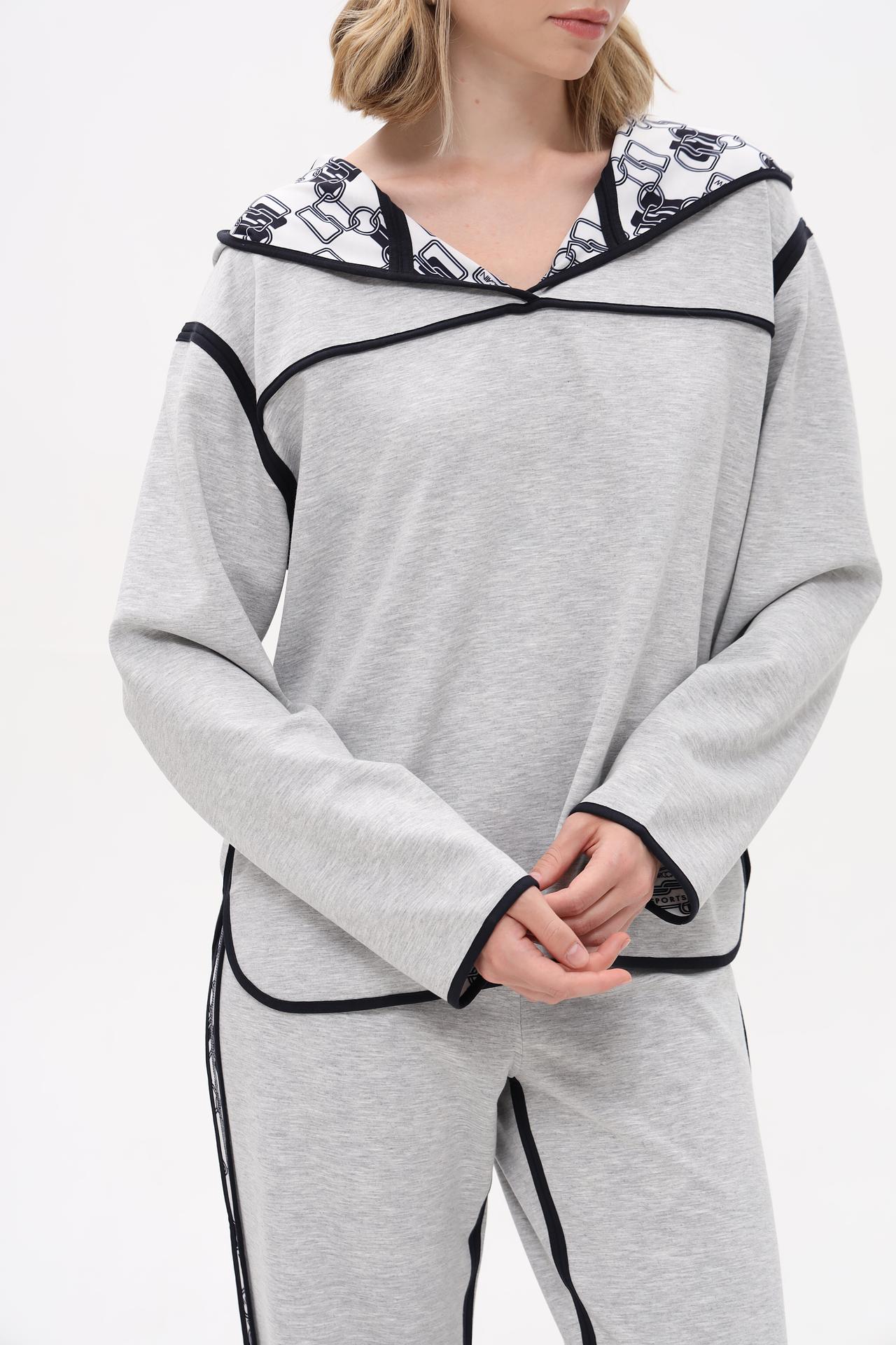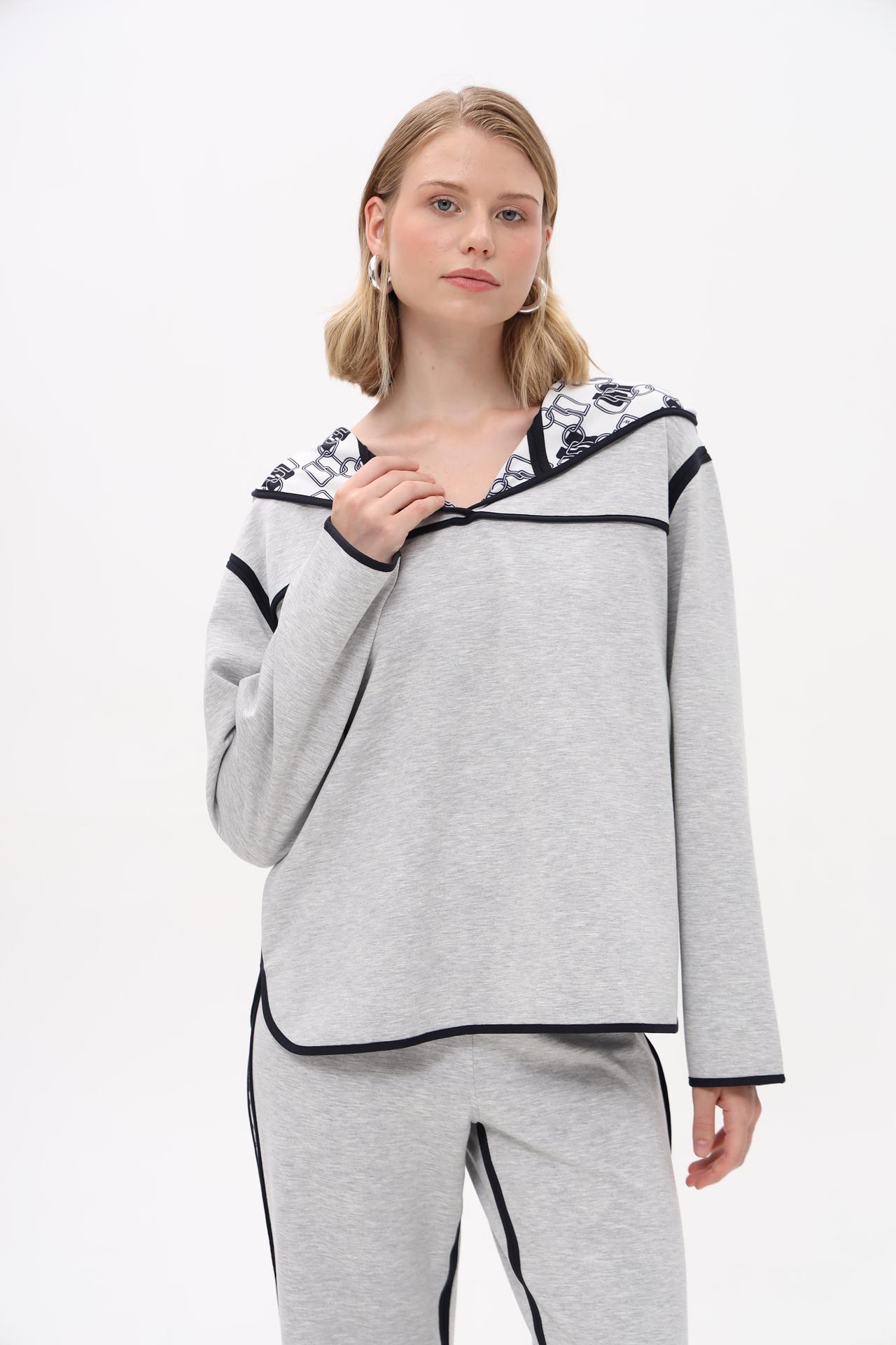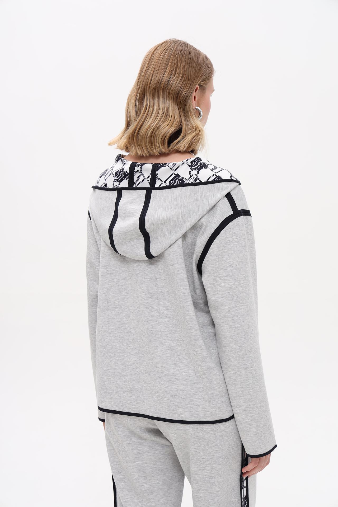 - Дизайн: Классический крой пуловера с V-образным вырезом и капюшоном, отделанным узнаваемым принтом Marc Cain. Контрастная окантовка по краю изделия и на рукавах подчеркивает элегантность модели.