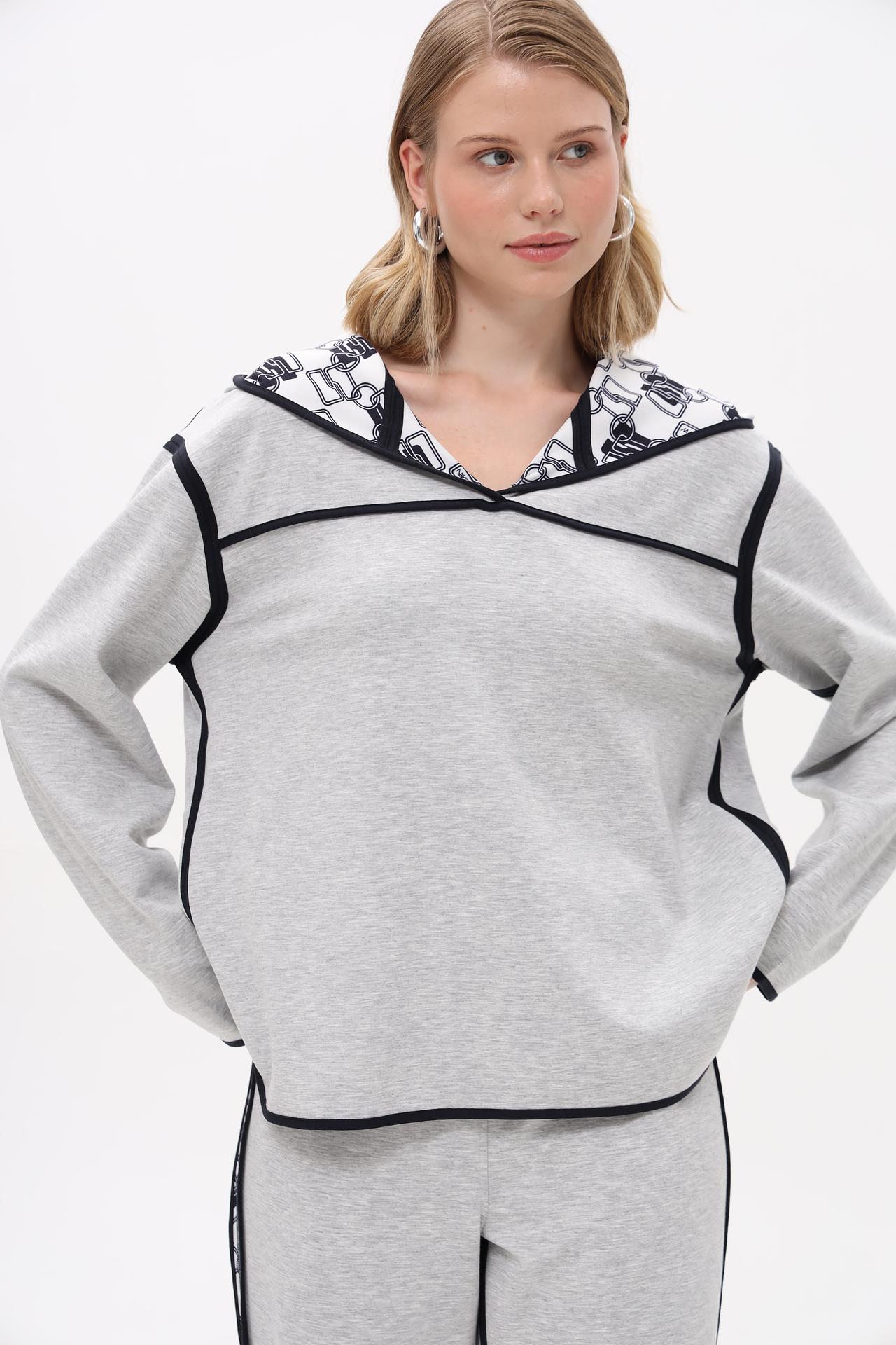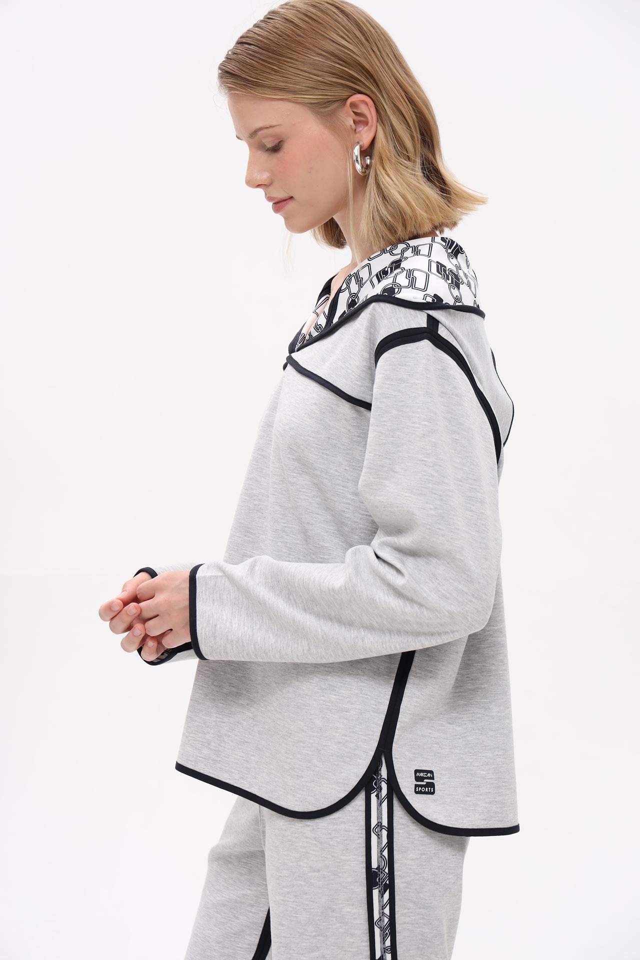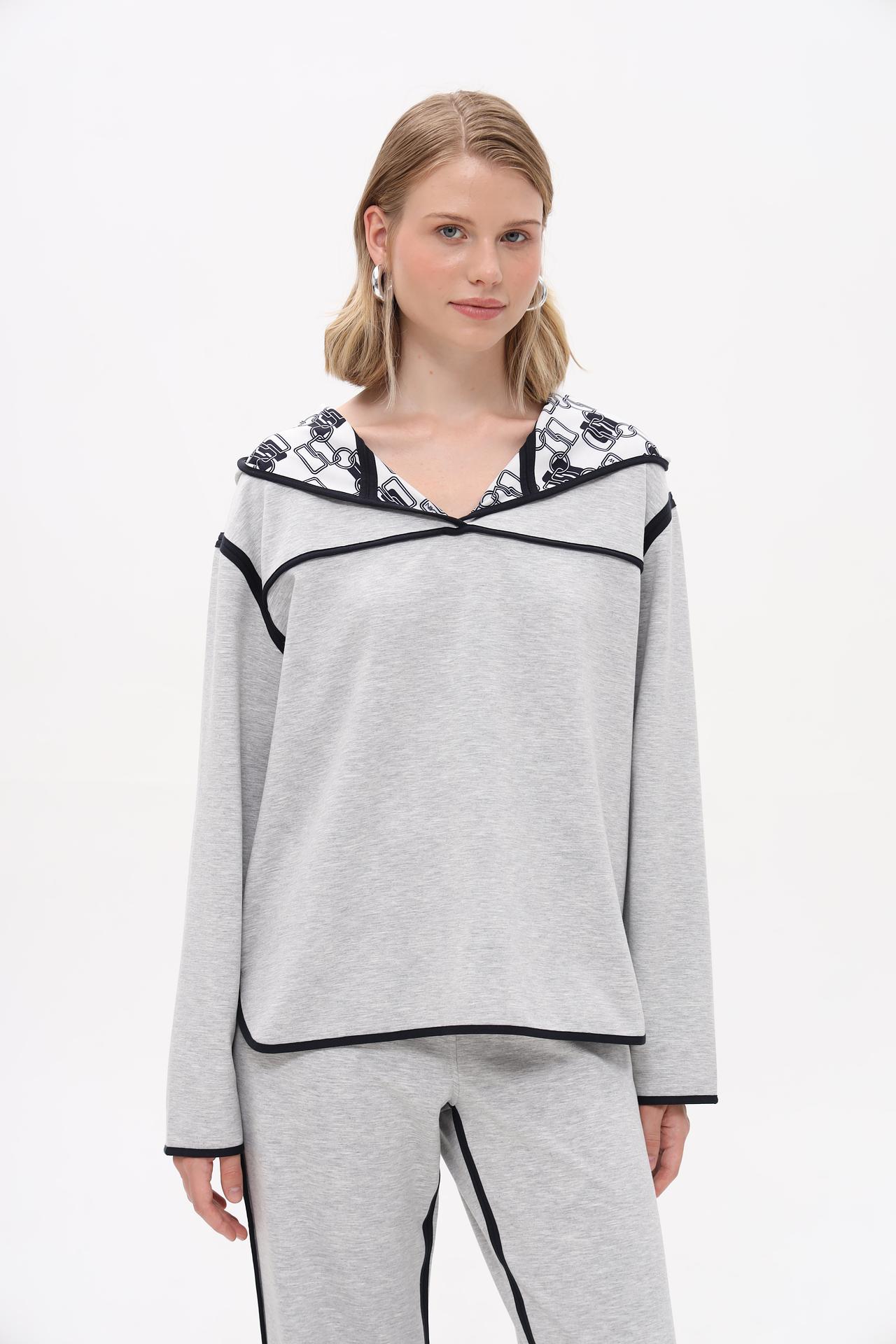 - Дизайн: Классический крой пуловера с V-образным вырезом и капюшоном, отделанным узнаваемым принтом Marc Cain. Контрастная окантовка по краю изделия и на рукавах подчеркивает элегантность модели.