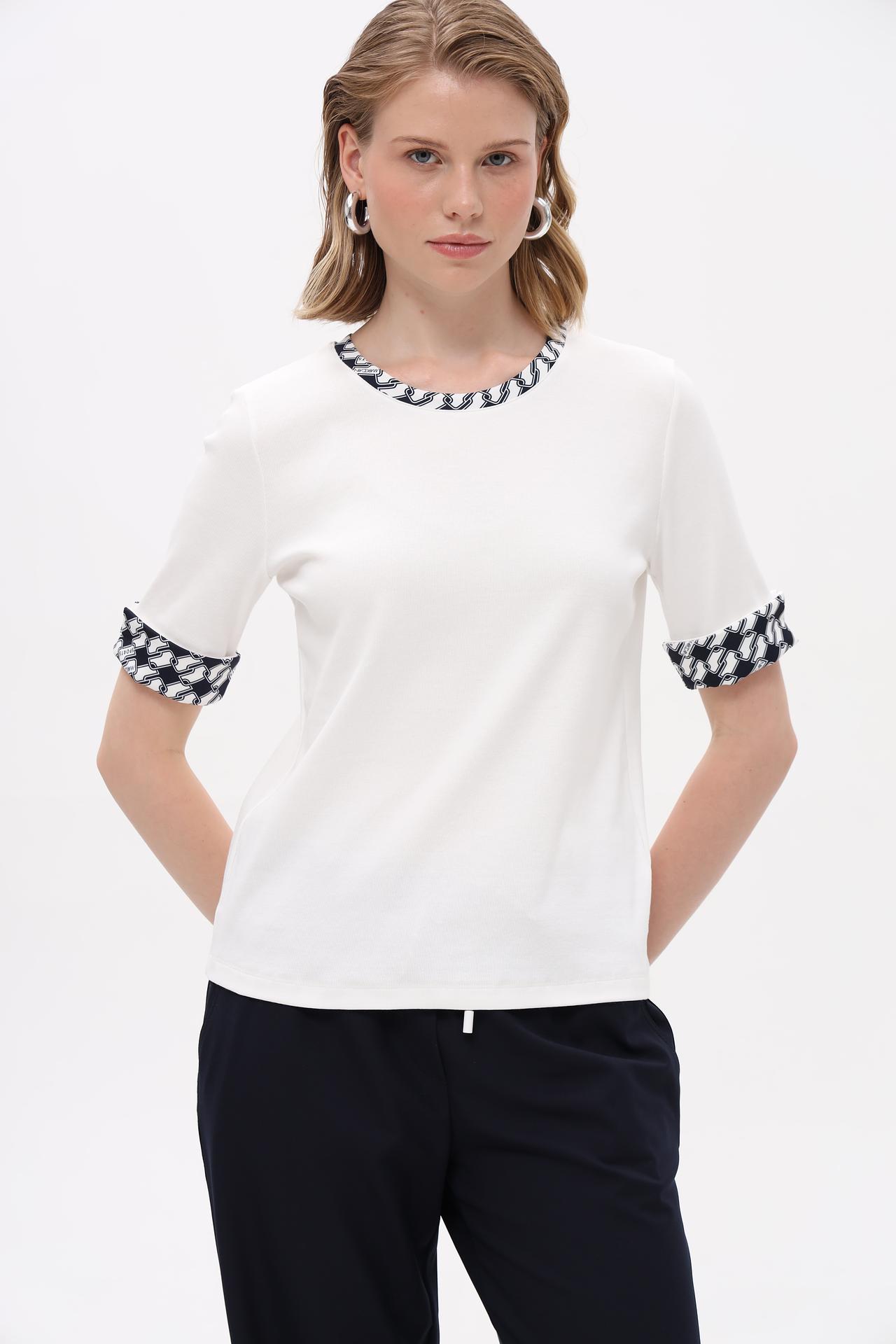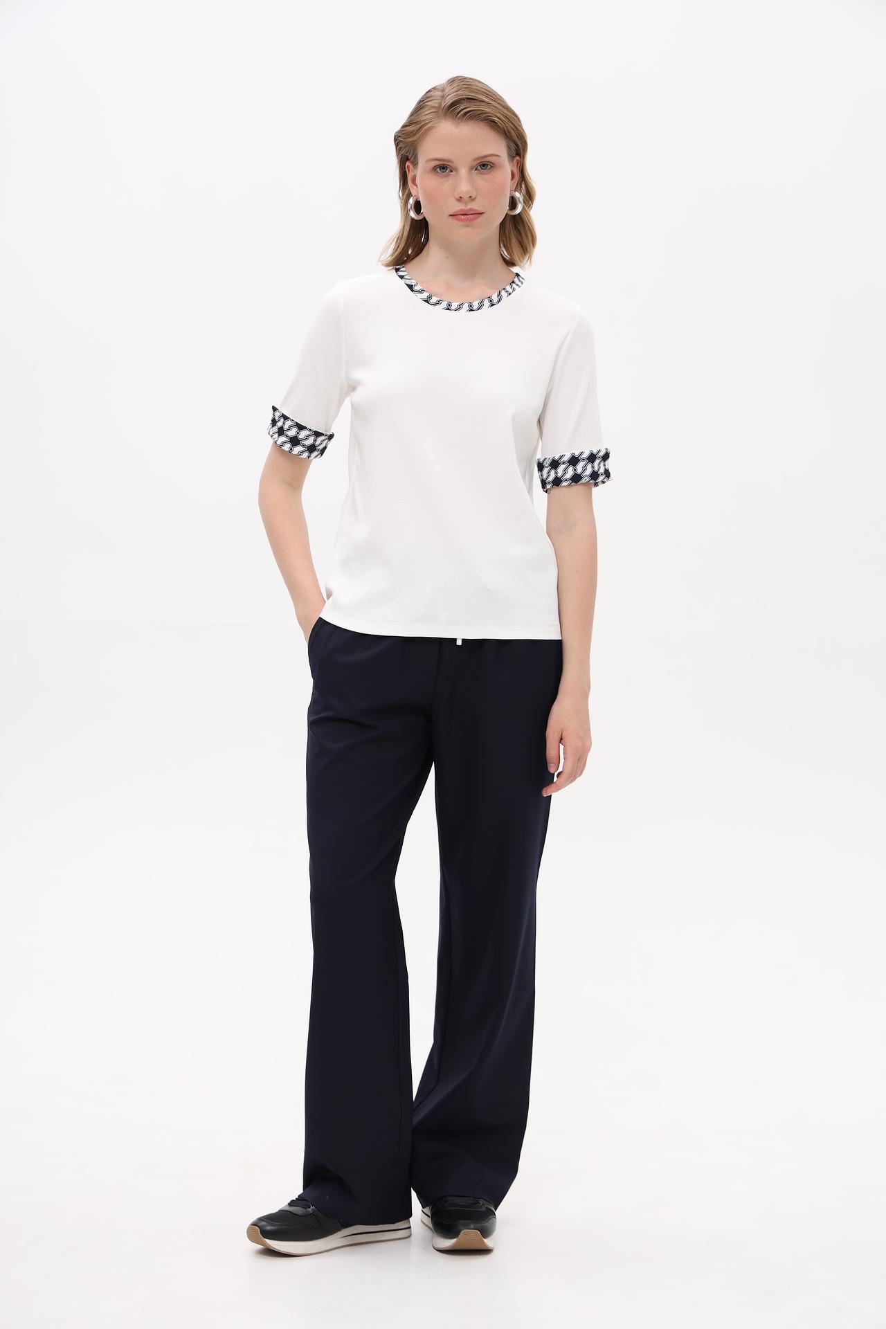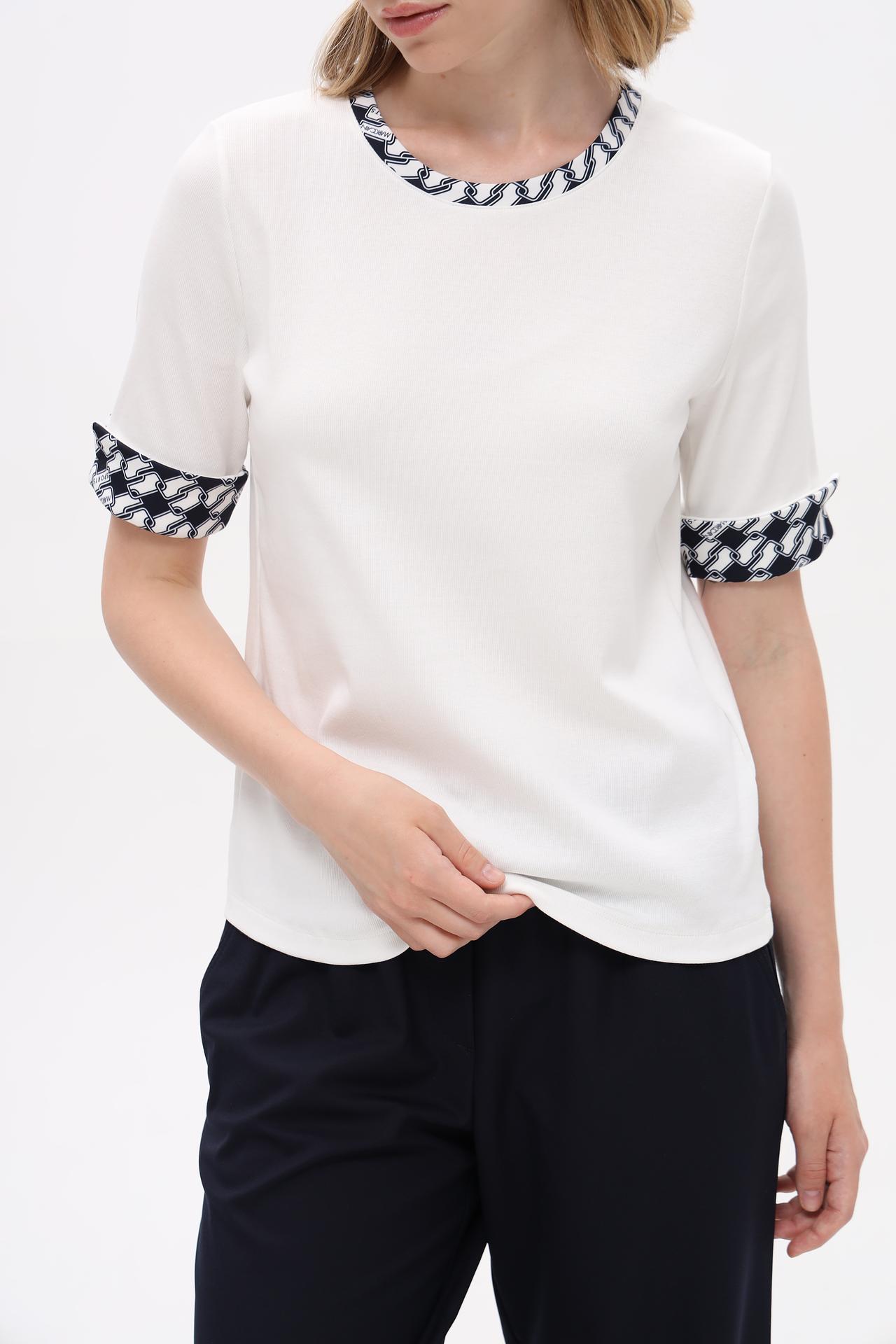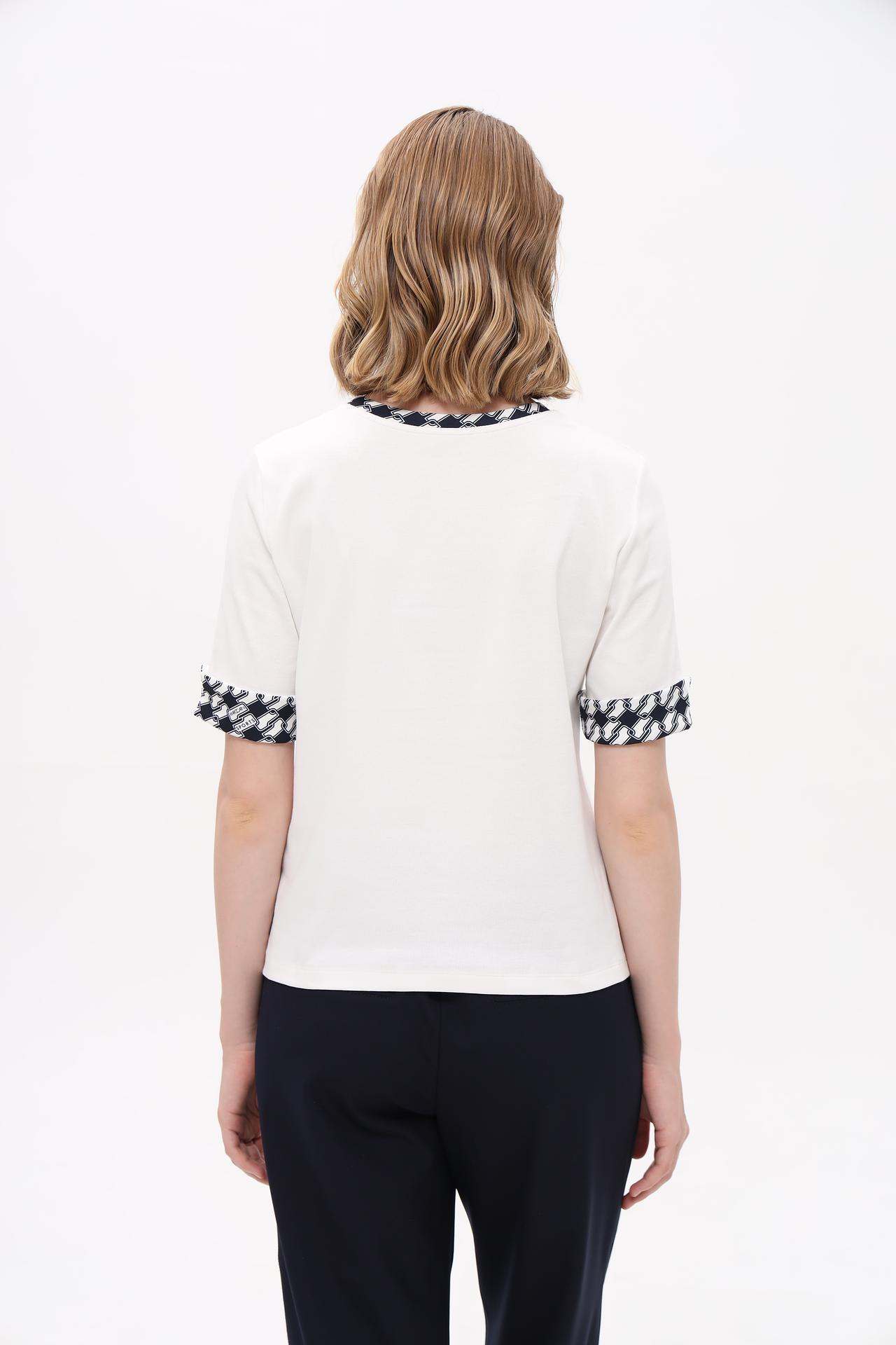 - Дизайн: Оригинальный узор «гусиная лапка» на рукавах и горловине придает футболке неповторимый стиль.