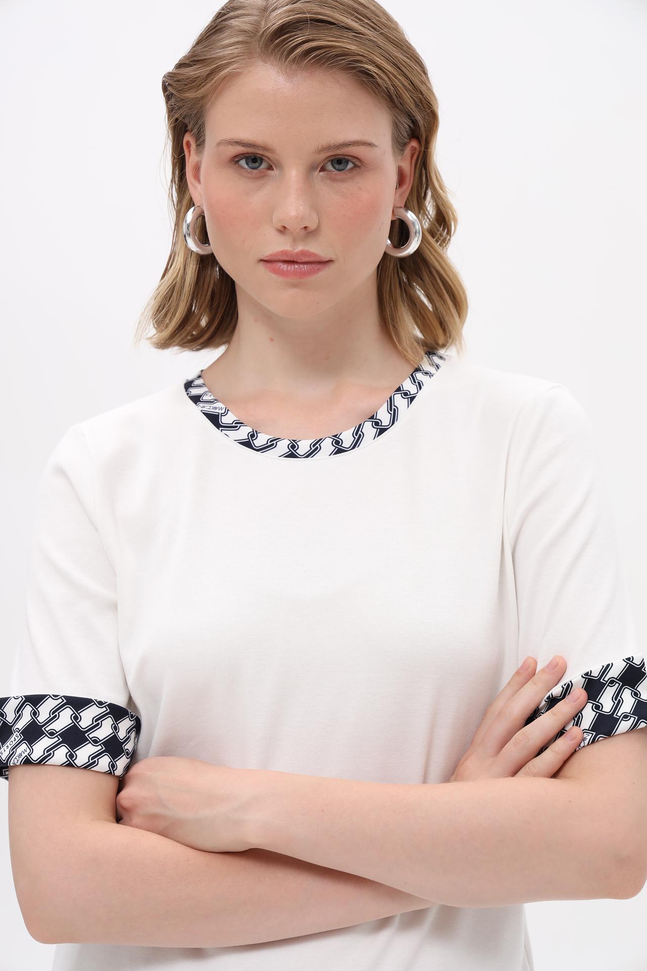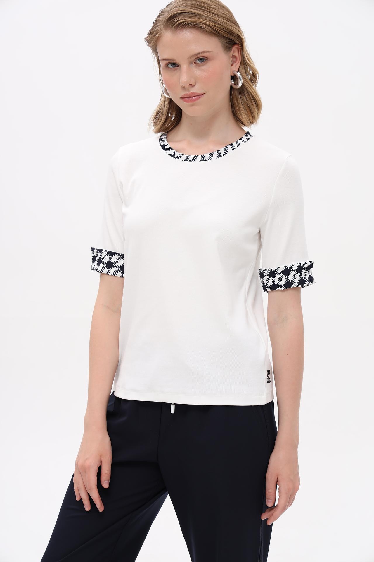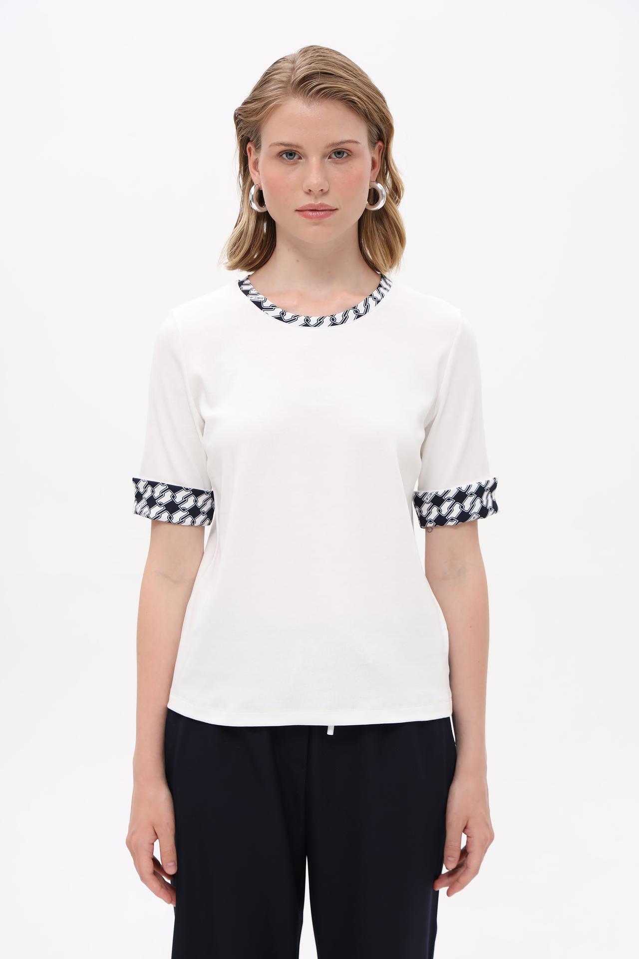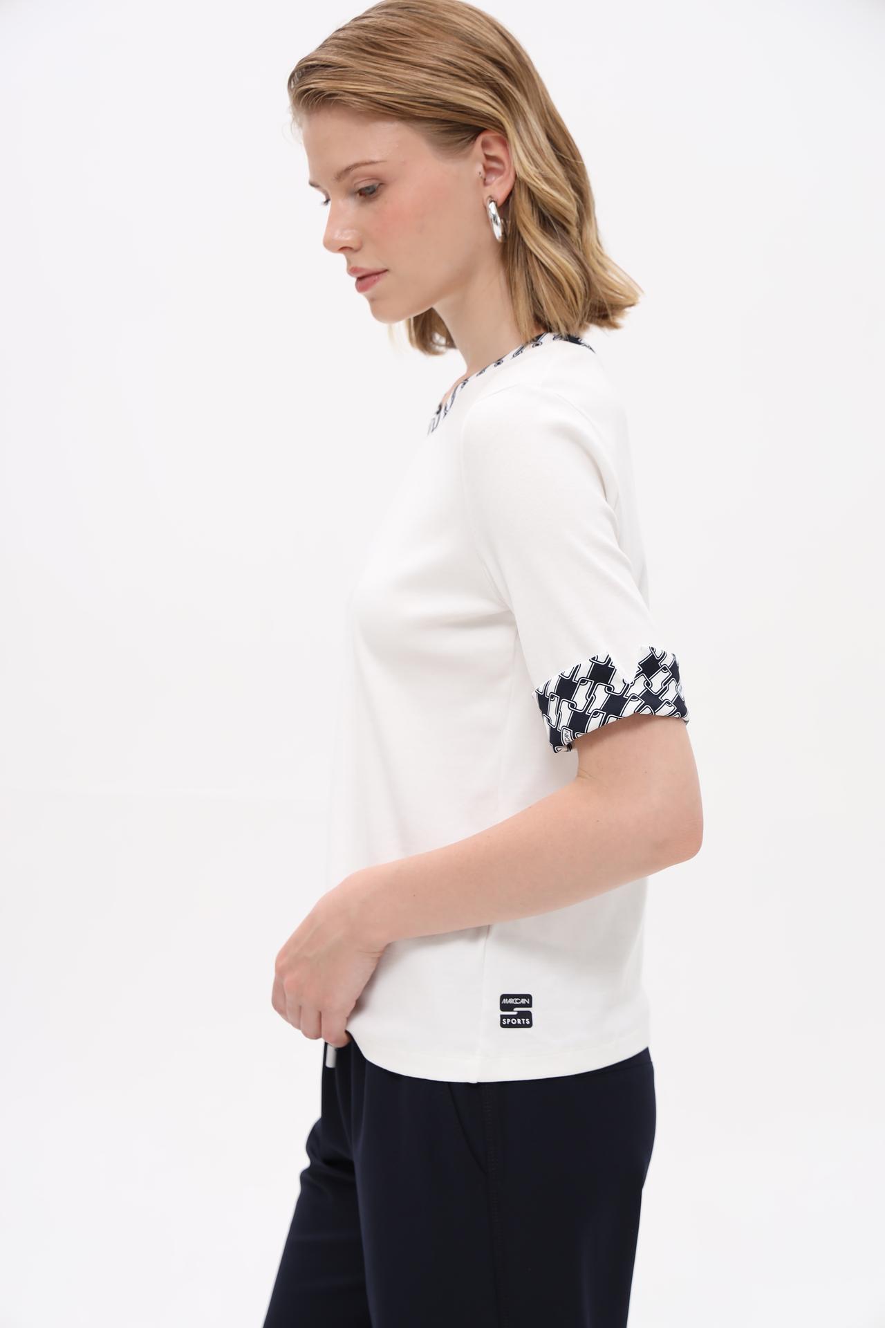 - Дизайн: Оригинальный узор «гусиная лапка» на рукавах и горловине придает футболке неповторимый стиль.