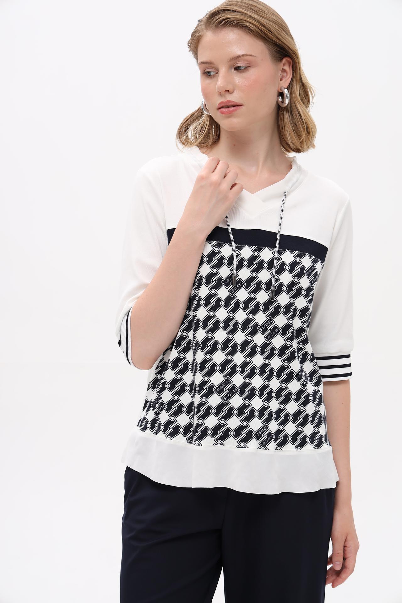 Классическая женская блуза Marc Cain станет идеальным дополнением вашего гардероба, предлагая утонченный стиль и комфорт. Модель выполнена в элегантной цветовой палитре, сочетающей чистый белый цвет с глубоким синим геометрическим узором. Эта модная блуза подчеркнет вашу индивидуальность и добавит изысканности в любой образ.