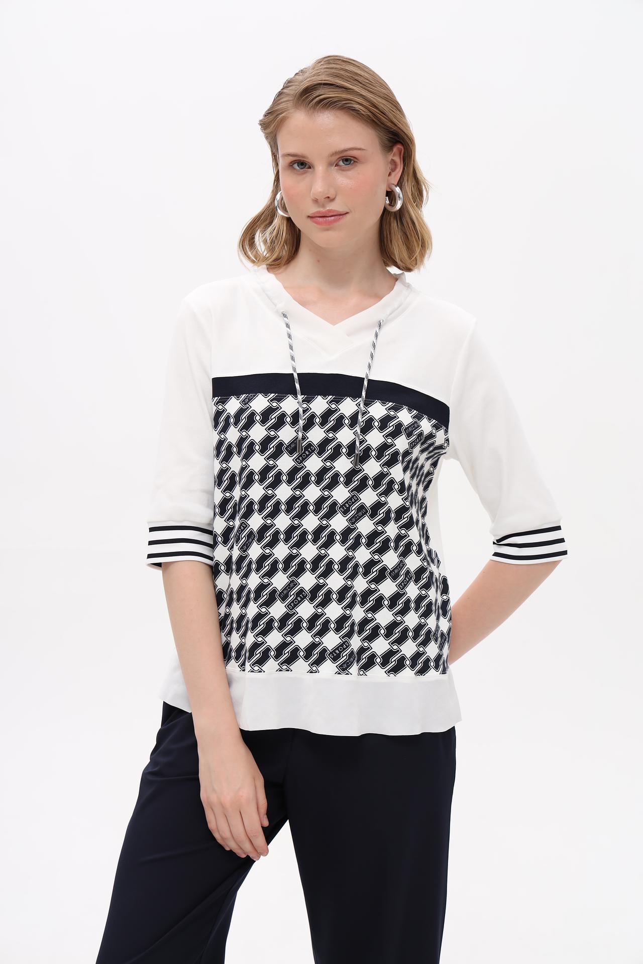 - Дизайн и узор: Блуза украшена эффектным геометрическим принтом в центральной части, создающим динамичный и современный акцент. Контрастные полосы на рукавах и декоративные завязки на V-образном вырезе добавляют изделию уникальности.