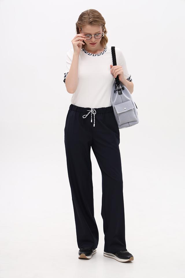 Брюки имеют широкий крой и эластичный пояс с кулиской, обеспечивающий комфортную посадку по фигуре. Завязки на талии позволяют регулировать облегание и подчеркивать талию.