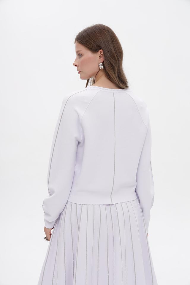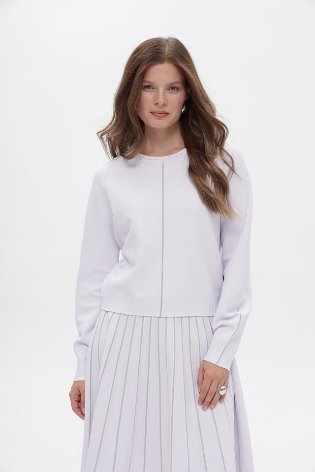 Изящный пуловер от Marc Cain, выполненный в нежном светло-лиловом оттенке. Модель имеет прямой силуэт, длинные рукава и круглый вырез горловины. Вертикальная декоративная строчка подчеркивает линию фигуры и придает изделию элегантный вид.