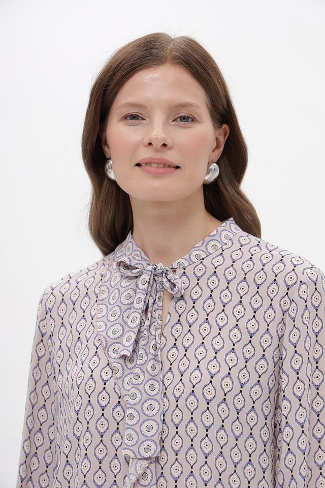 Бежевая блузка Marc Cain Collections с оригинальным принтом и завязками на воротнике. Изготовлена из 100% вискозы, что обеспечивает комфорт и легкость в носке. Состав: вискоза 100%