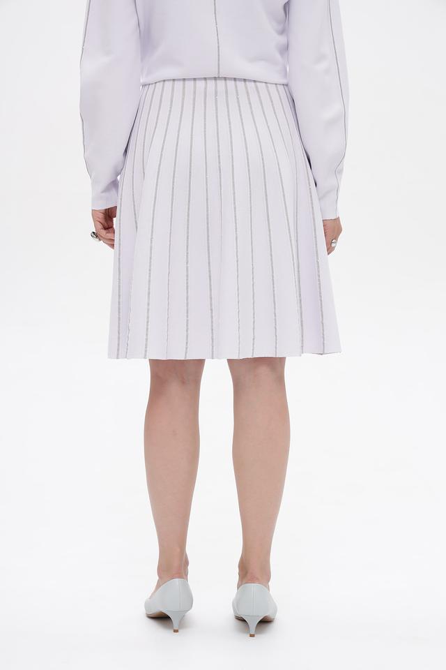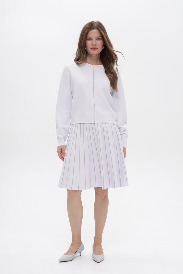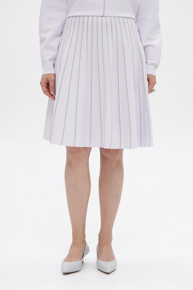 Юбка имеет классический крой с вертикальными складками, которые визуально удлиняют силуэт и придают образу лёгкость. Текстура ткани с деликатными полосками добавляет оригинальности и делает юбку более интересной.
