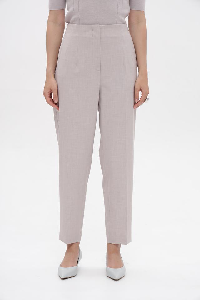 Брюки имеют высокую посадку, подчеркивающую талию и визуально удлиняющую ноги. Застежка-молния и пуговица обеспечивают надежную фиксацию. Модель дополнена боковыми карманами для удобства.