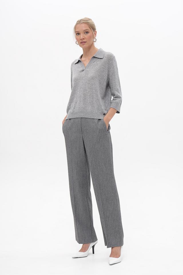Представляем элегантные брюки от бренда Marc Cain. Модель выполнена в сером цвете с тонкой вертикальной полоской, что визуально вытягивает силуэт.