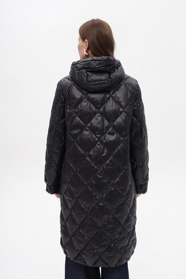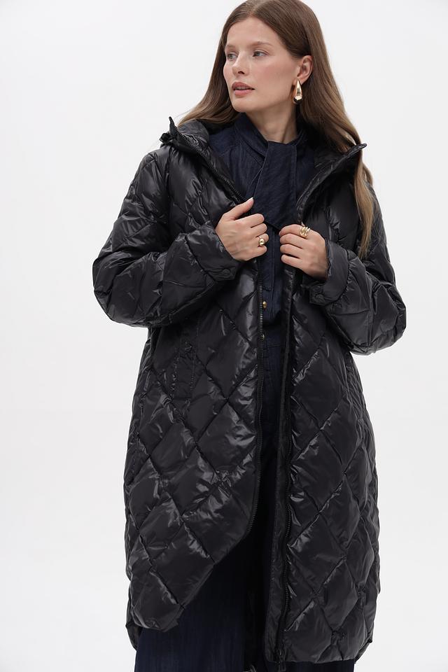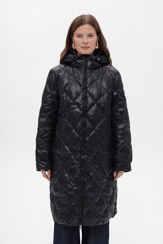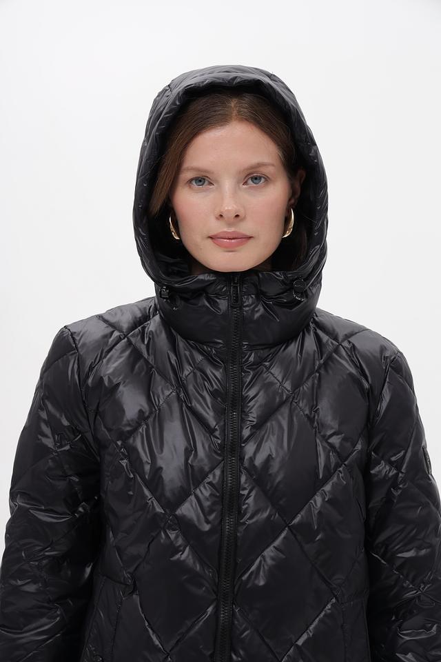Черное стеганое пальто Marc Cain из 100% полиамида — стильное и практичное решение для прохладной погоды. Модель с капюшоном и удобными карманами. Состав: полиамид 100%