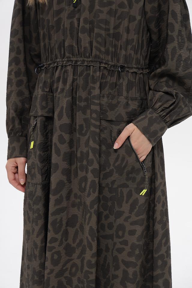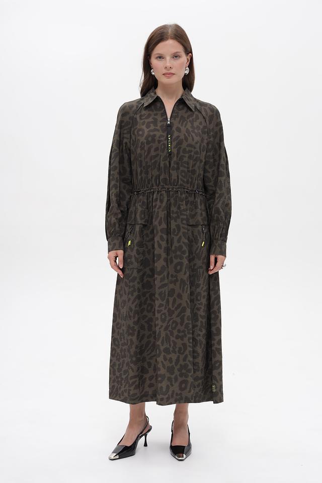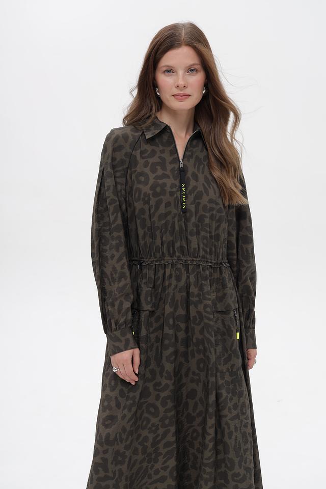 Платье Marc Cain Sports цвета хаки с леопардовым принтом – стильное и комфортное решение для повседневного образа. Модель выполнена из вискозы с добавлением полиамида, имеет воротник рубашечного типа и застежку-молнию. Состав: вискоза 85%, полиамид 15%