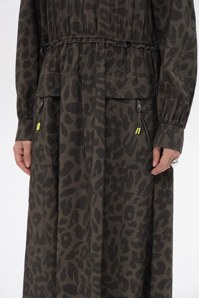 Это платье от Marc Cain Sports сочетает в себе элегантность и удобство. Выполнено в хаки цвете с эффектным леопардовым принтом, что делает его ярким акцентом в гардеробе.
