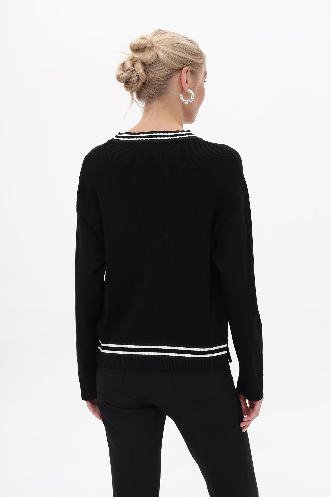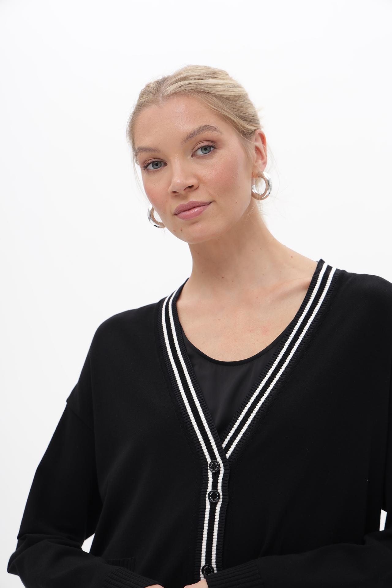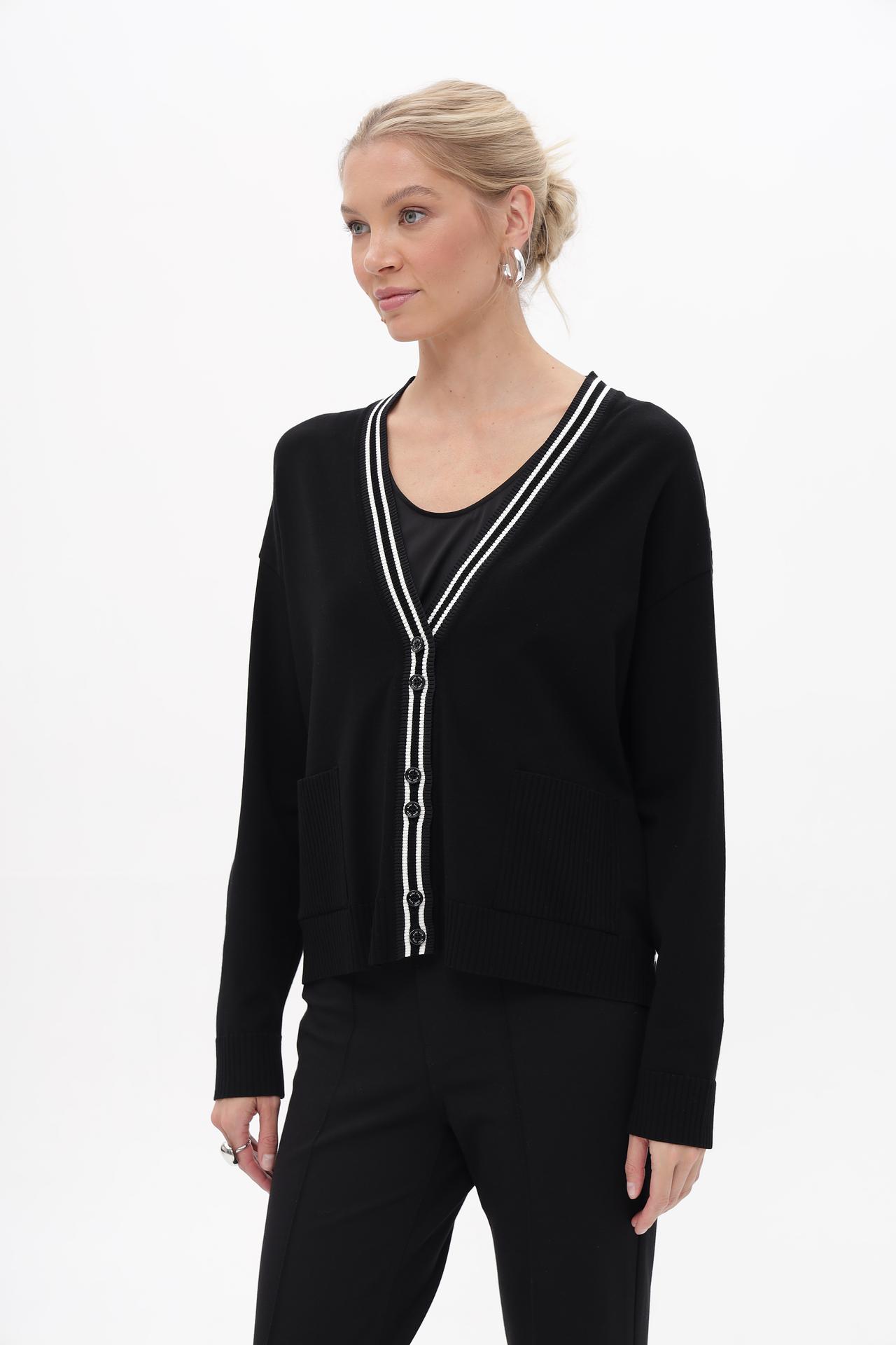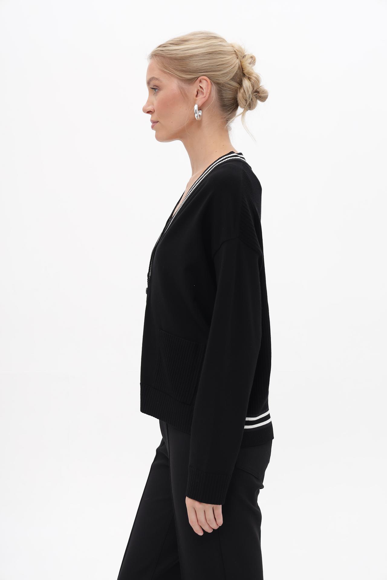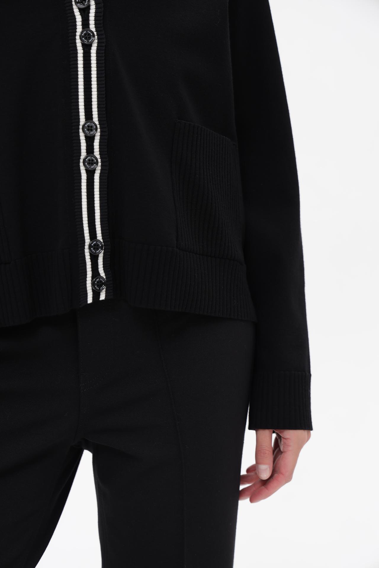 Элегантный черный жакет от Marc Cain — незаменимая вещь в гардеробе современной женщины. Классический крой и минималистичный дизайн делают его универсальным решением для создания как повседневных, так и более изысканных образов. Контрастная белая окантовка вдоль застежки и по низу изделия добавляет нотку спортивного шика.