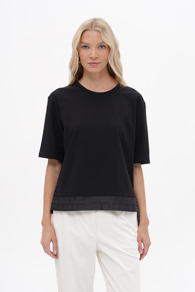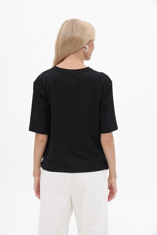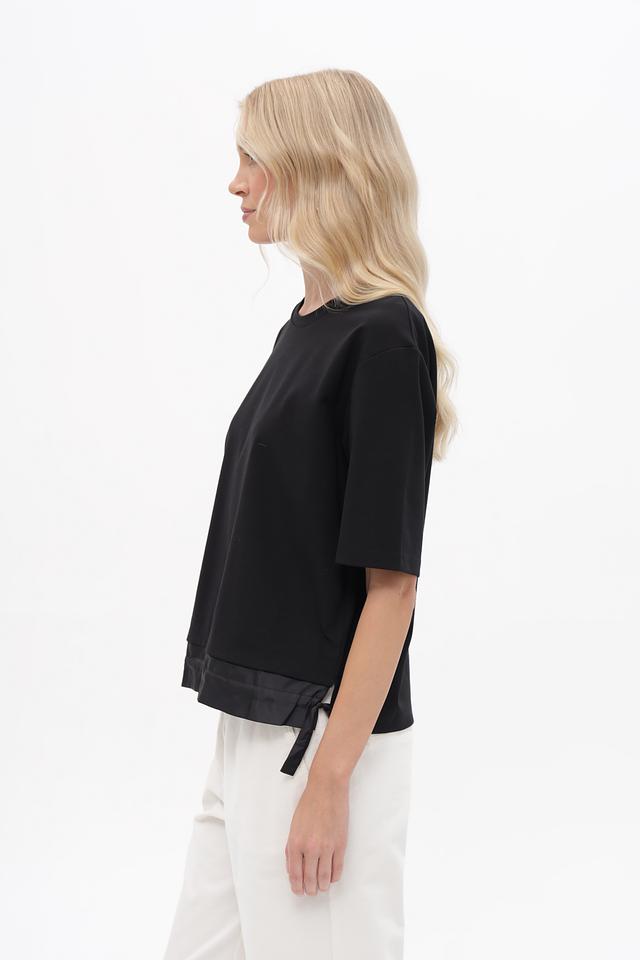 Чёрный пуловер Marc Cain с короткими рукавами и контрастной отделкой. Изготовлен из мягкого хлопка с модалом и небольшим добавлением эластана для комфортной посадки. Состав: хлопок 47%, модал 47%, эластан 6%