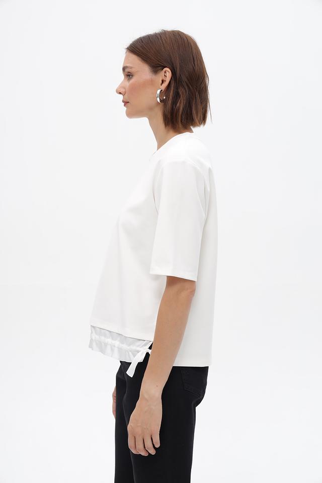 Модель имеет короткие рукава и свободный крой, обеспечивающий комфорт при ношении. Особый акцент сделан на декоративные оборки по нижнему краю, которые придают изделию женственность и изысканность.