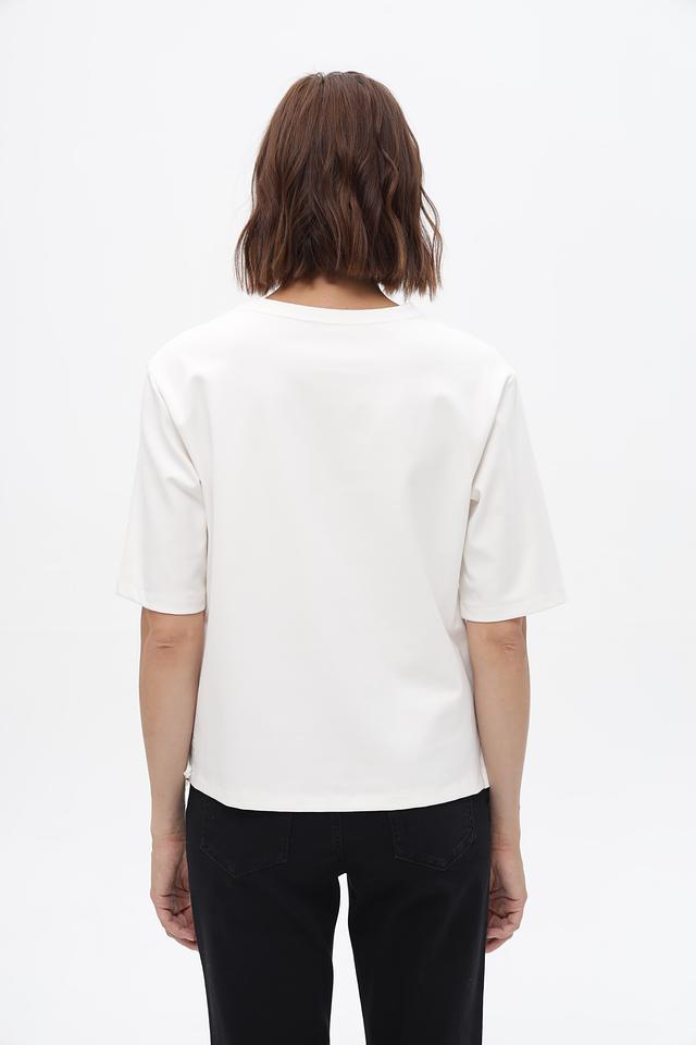 Белый пуловер от Marc Cain с короткими рукавами и декоративными оборками. Изготовлен из хлопка, модала и эластана, обеспечивающих комфорт и удобство в носке. Состав: хлопок 47%, модал 47%, эластан 6%