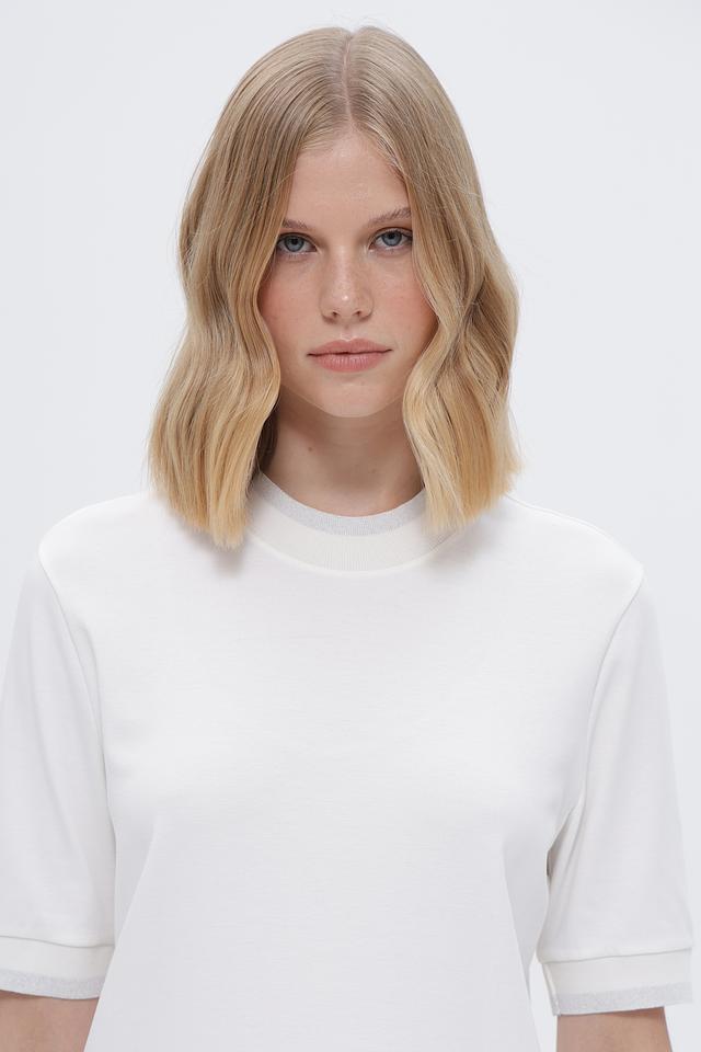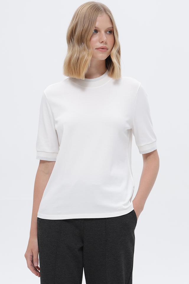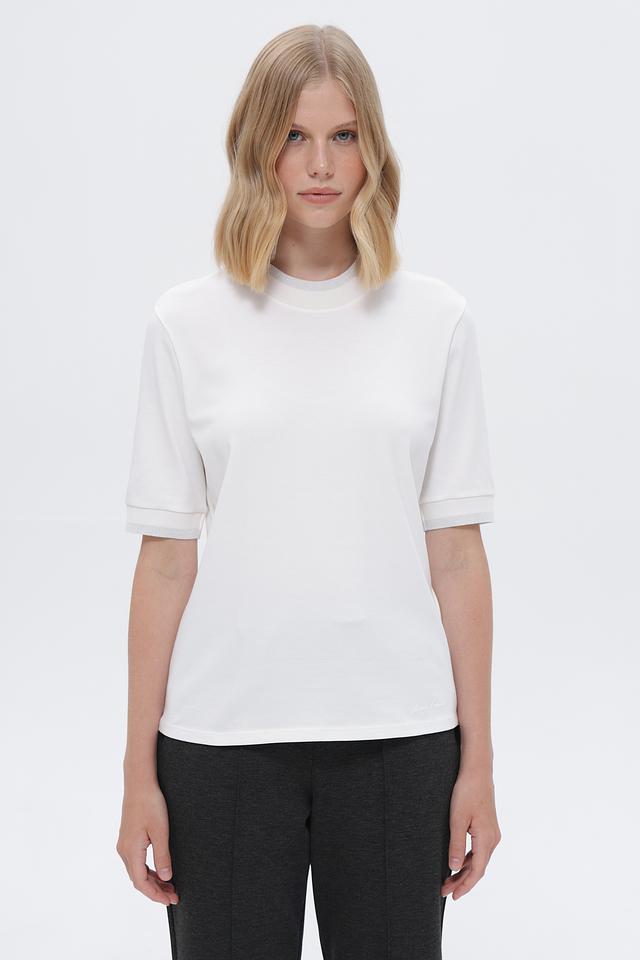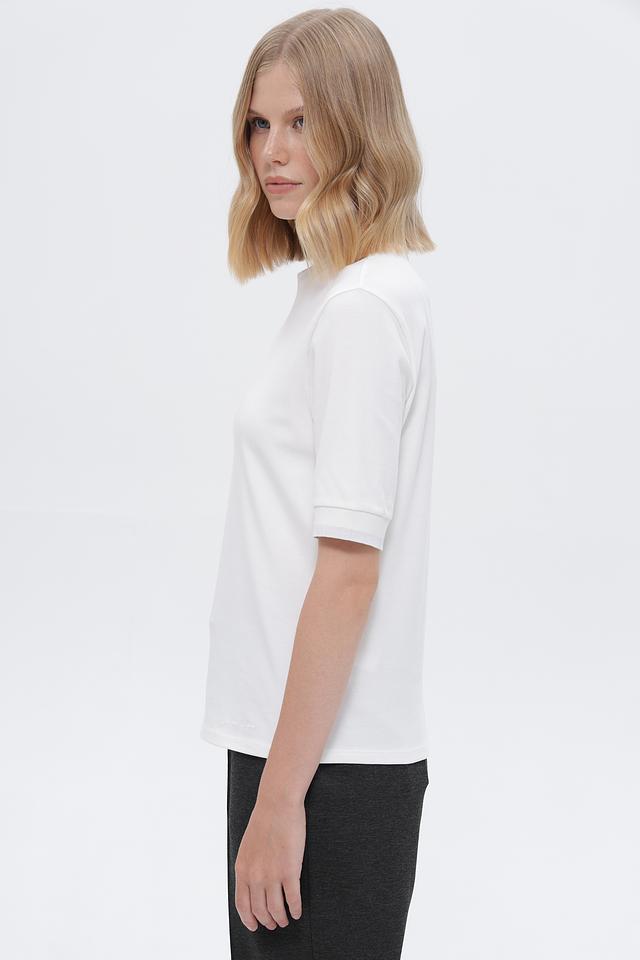 Футболка имеет прямой крой, короткий рукав и классический круглый вырез горловины. Минималистичный дизайн подчеркивает элегантность и универсальность модели. Небольшой логотип бренда вышит на нижней части изделия.