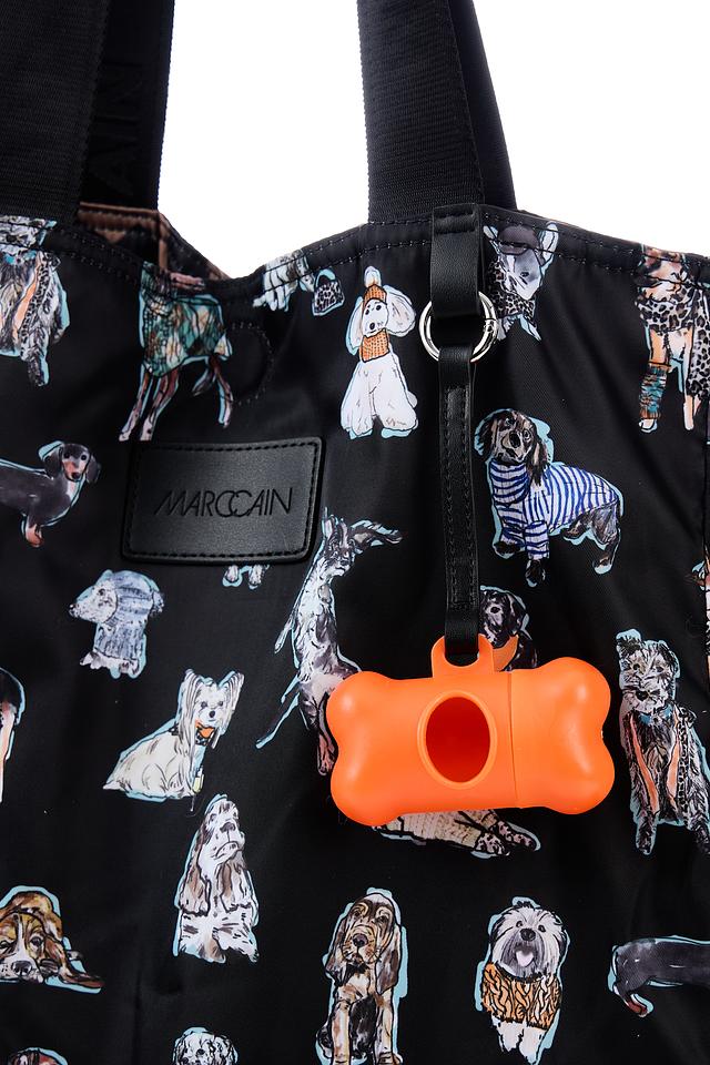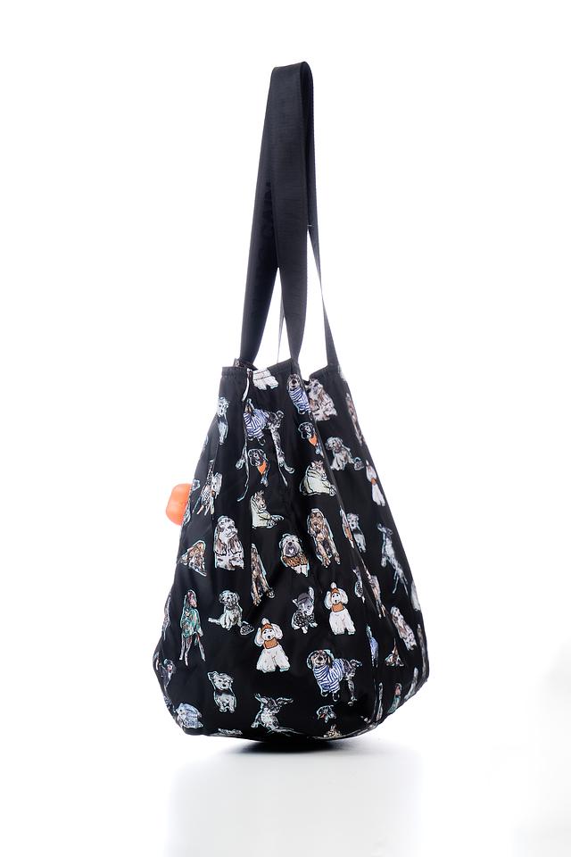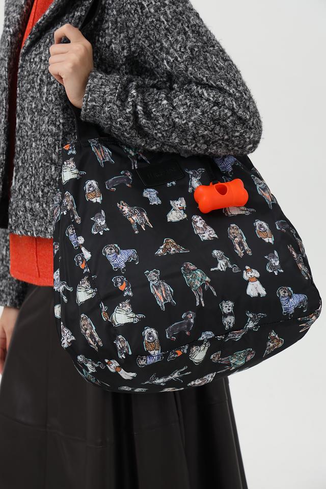 Основной цвет сумки – чёрный, а ярким акцентом служит оригинальный принт с изображением различных пород собак.