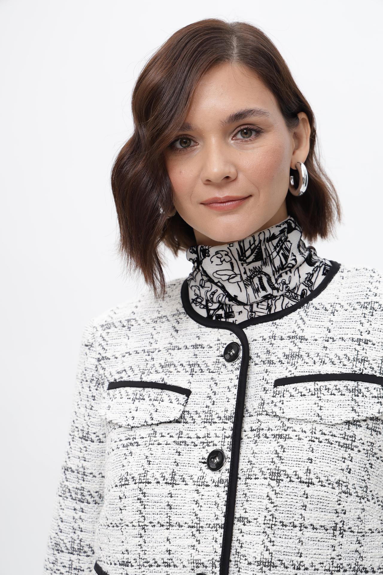 - Крой: Жакет имеет приталенный силуэт, который выгодно подчеркивает фигуру, создавая женственный и элегантный образ.