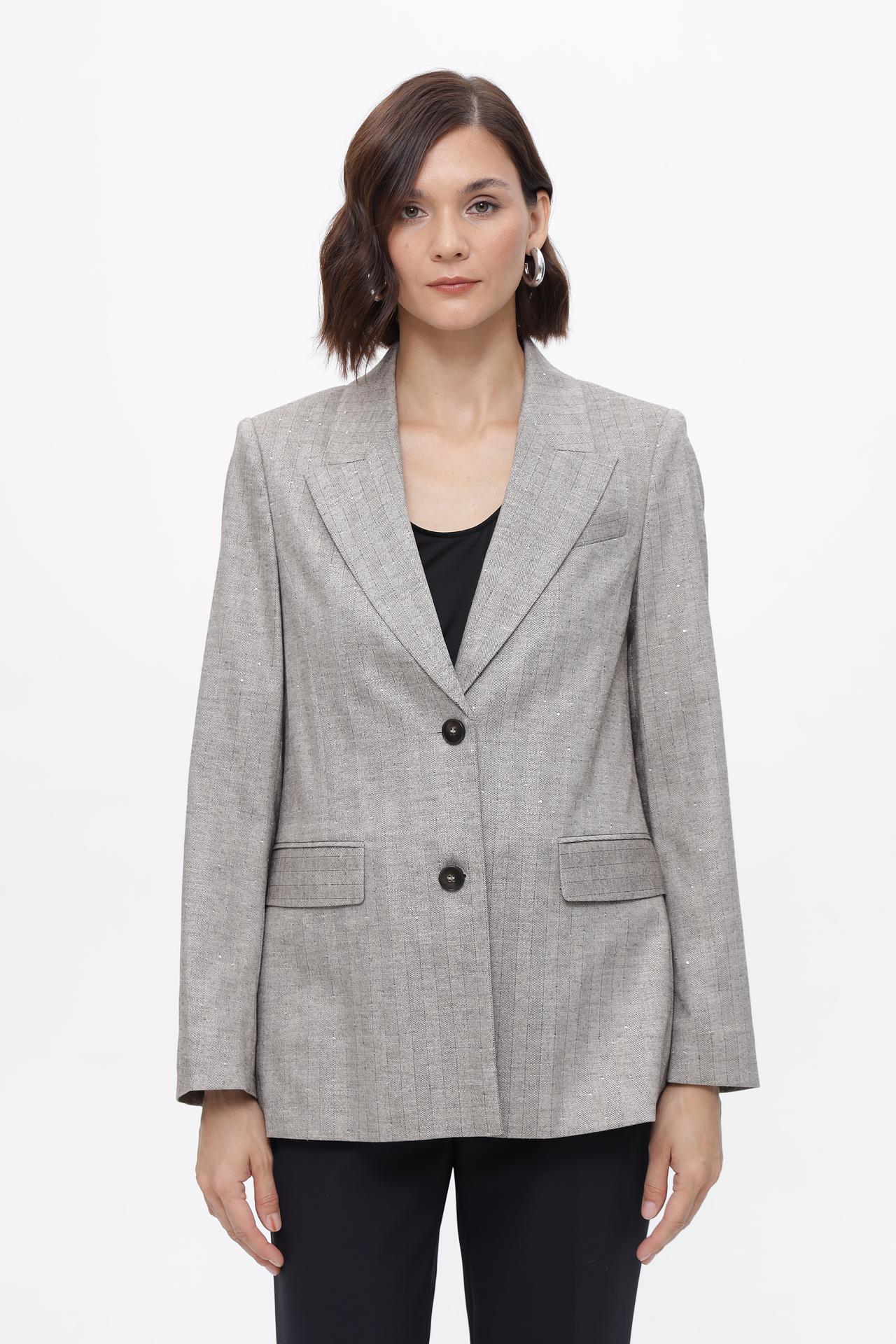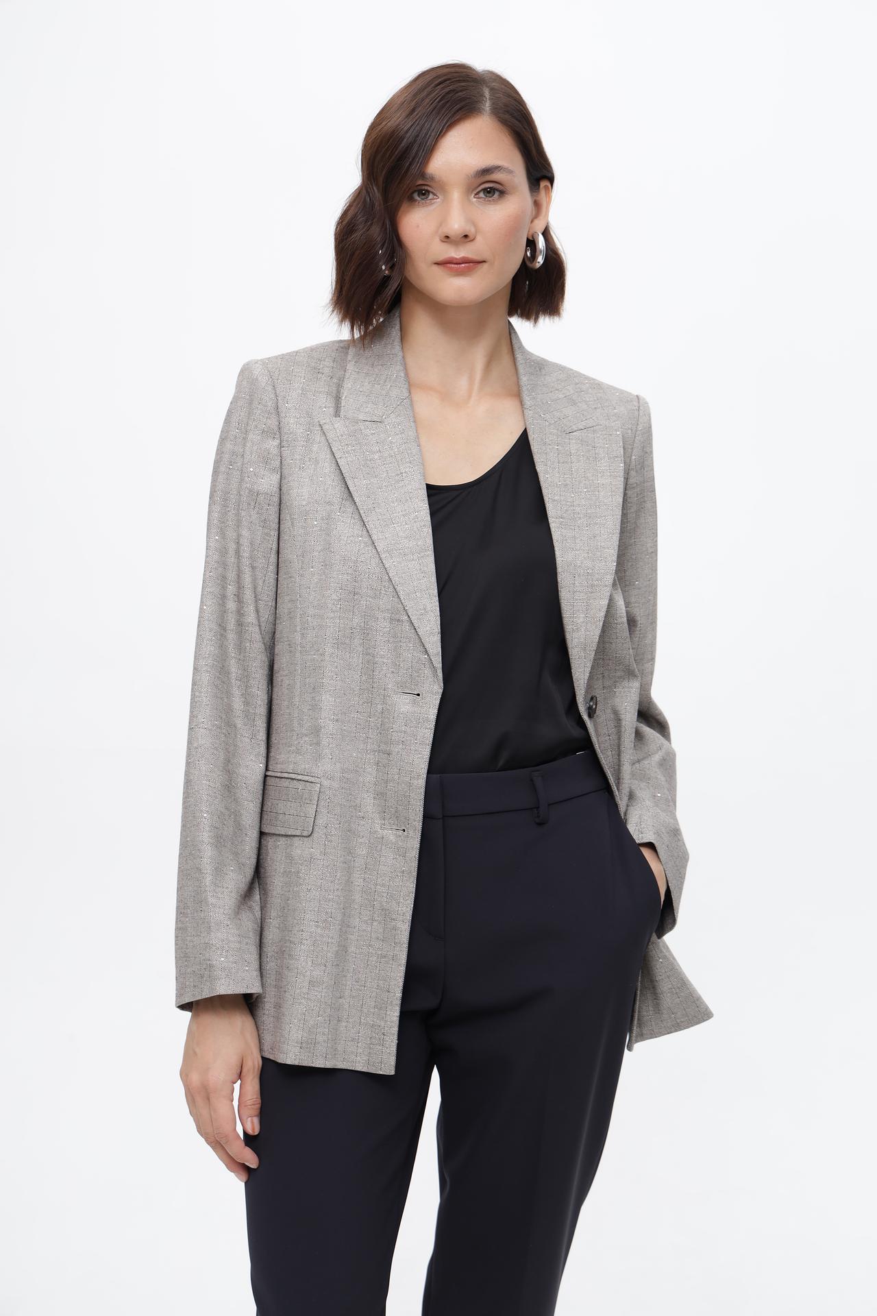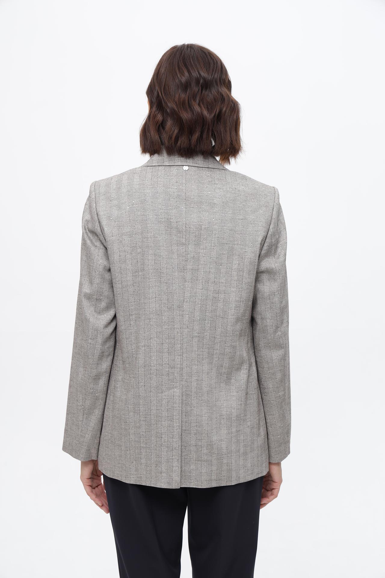 • Дизайн: Классический однобортный жакет с двумя пуговицами и английским воротником. Модель украшена деликатным вертикальным принтом с мерцающими вкраплениями, добавляющими образу шик.
