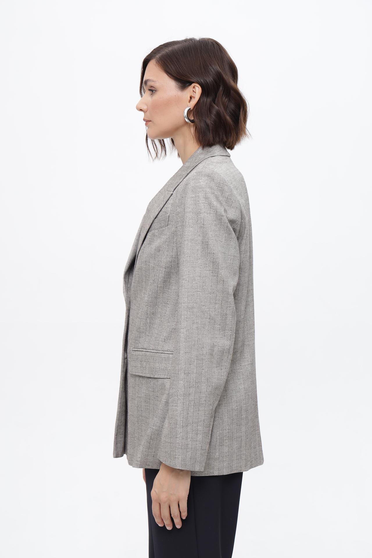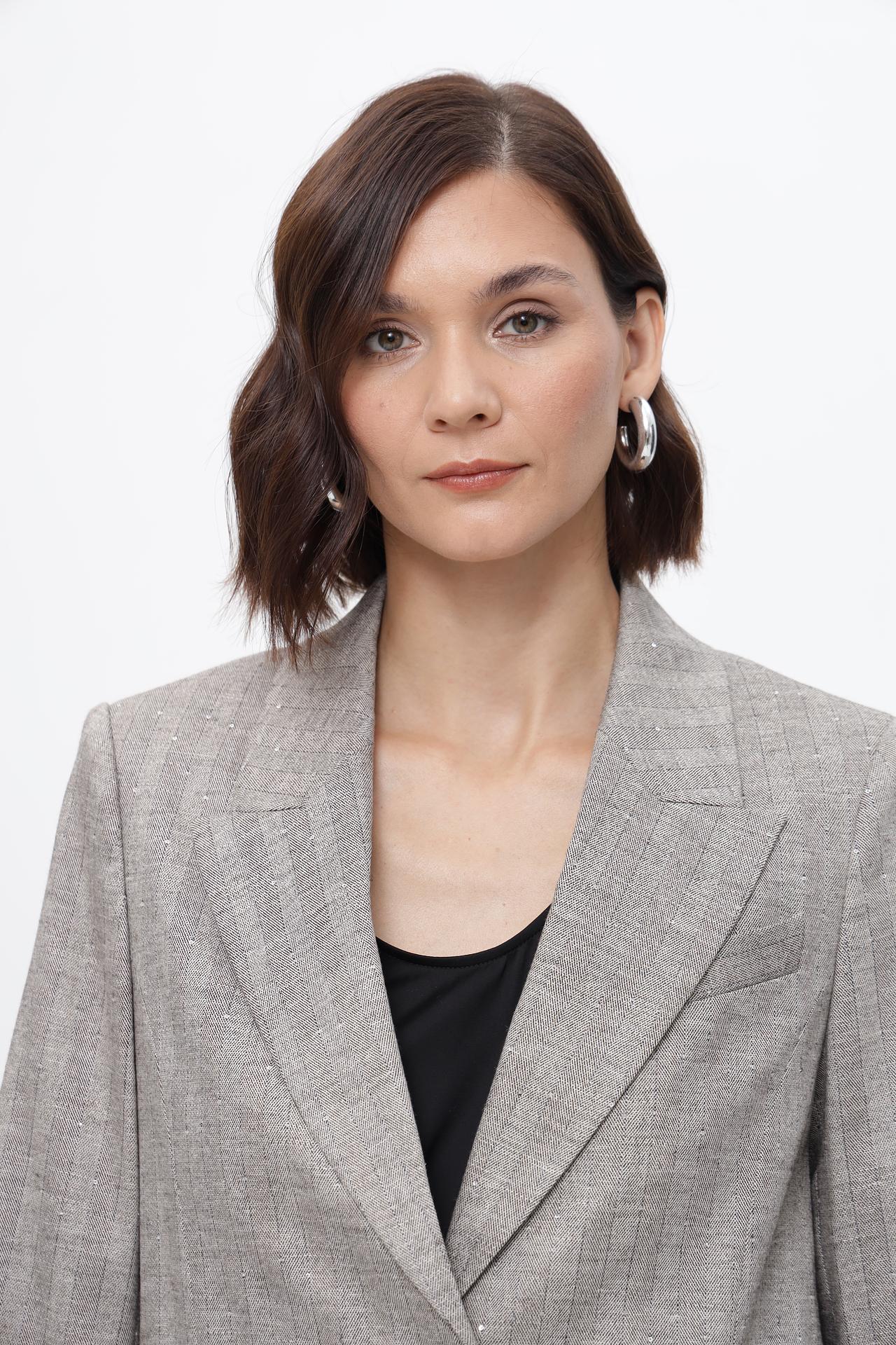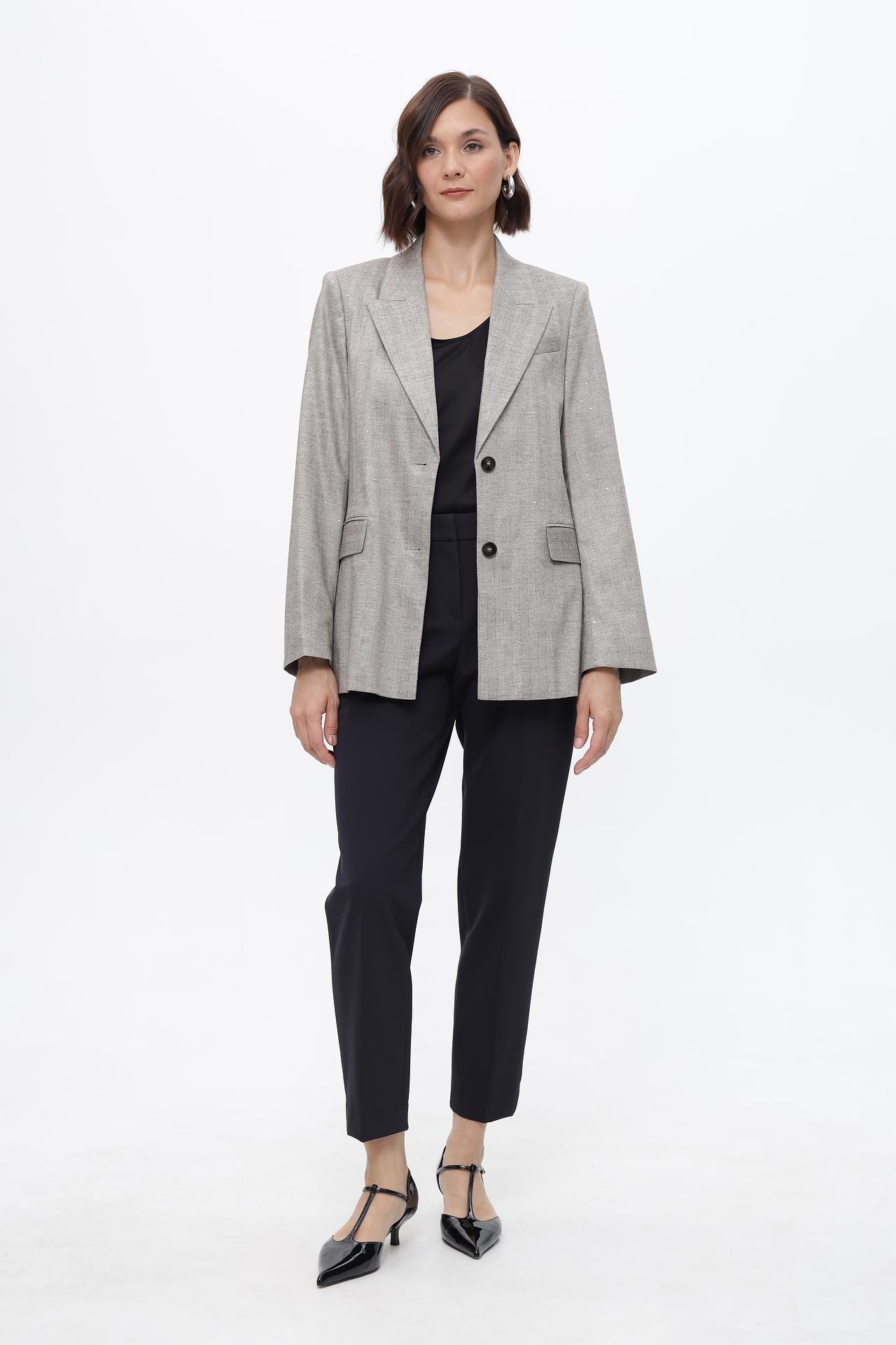 • Дизайн: Классический однобортный жакет с двумя пуговицами и английским воротником. Модель украшена деликатным вертикальным принтом с мерцающими вкраплениями, добавляющими образу шик.