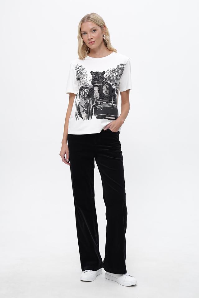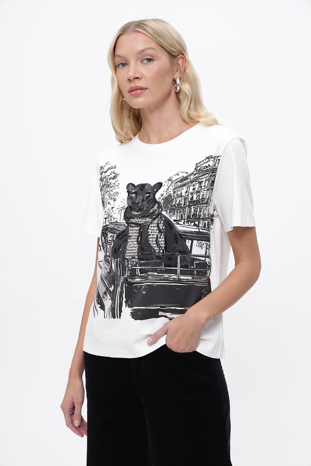 Особенность этой модели - оригинальный принт с изображением медведя, выполненный в графичном стиле на фоне городского пейзажа. Такой рисунок добавит образу индивидуальности и неповторимости. Футболка идеально подойдет для создания стильных повседневных образов.