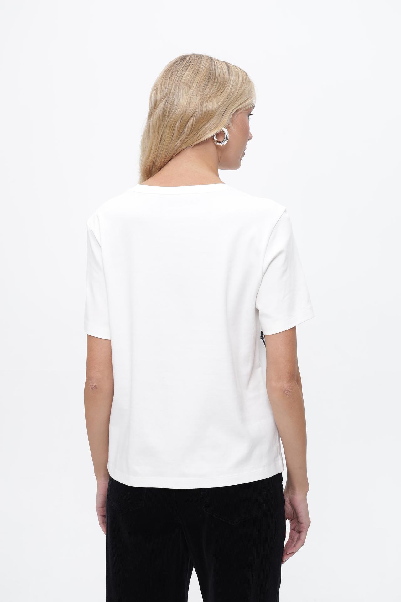 Дизайн футболки отличается лаконичностью и изысканностью, что подчеркивает безупречный вкус ее обладательницы. Приятный на ощупь материал обеспечивает максимальный комфорт на протяжении всего дня, а классический крой гарантирует идеальную посадку по фигуре. Эта футболка – воплощение современного стиля и безупречного качества от Marc Cain, бренда, известного своим вниманием к деталям и любовью к моде.