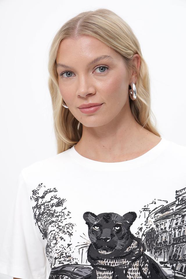 Белая футболка Marc Cain с оригинальным графичным принтом медведя на фоне городского пейзажа. Изготовлена из 100% хлопка, обеспечивающего комфорт и воздухопроницаемость. Стильный и удобный выбор для повседневного образа. Состав: хлопок 100%
