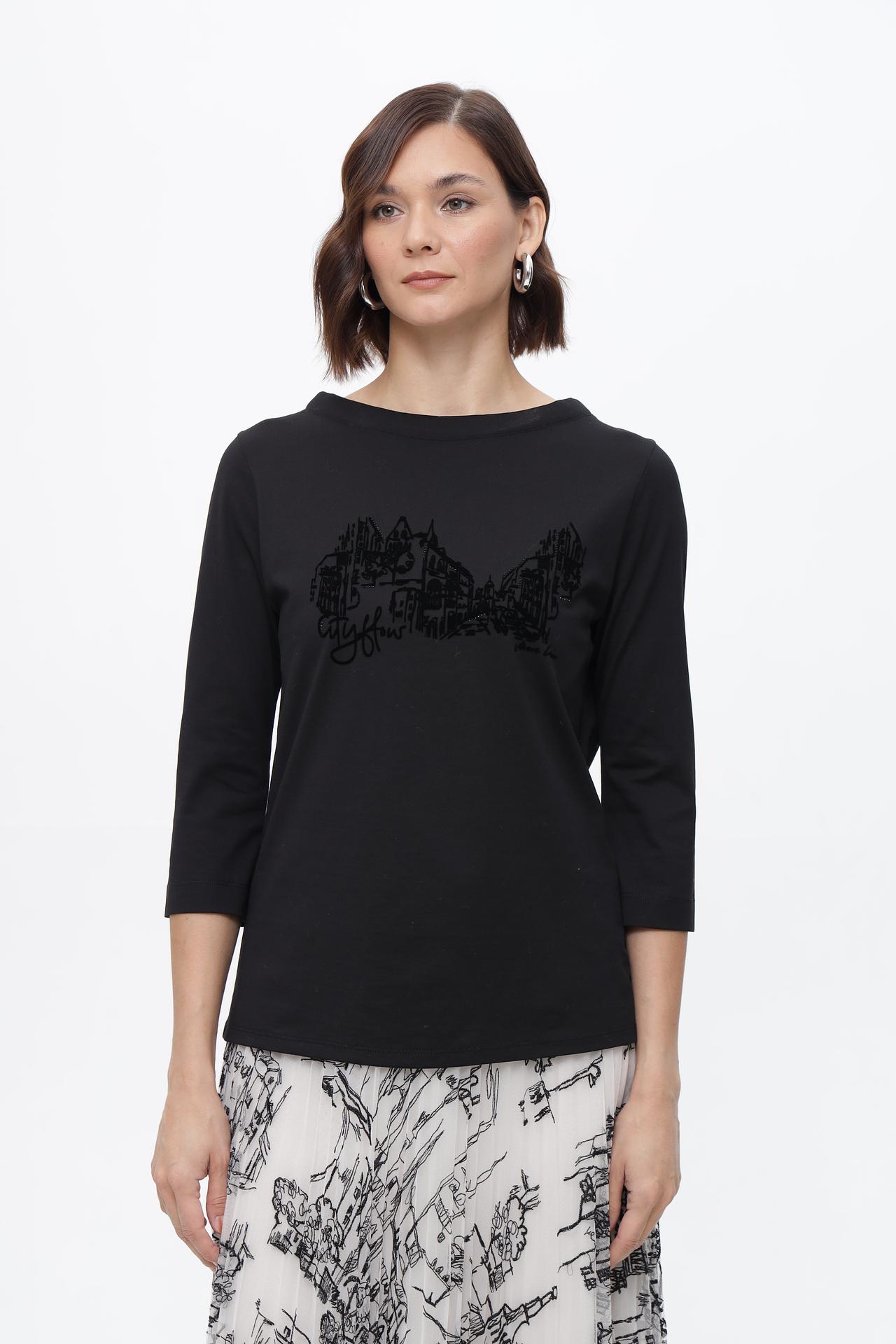 - Дизайн: Черная футболка с оригинальным принтом, изображающим городской пейзаж. Принт выполнен в тон изделия, что придает ему изысканность и стиль.