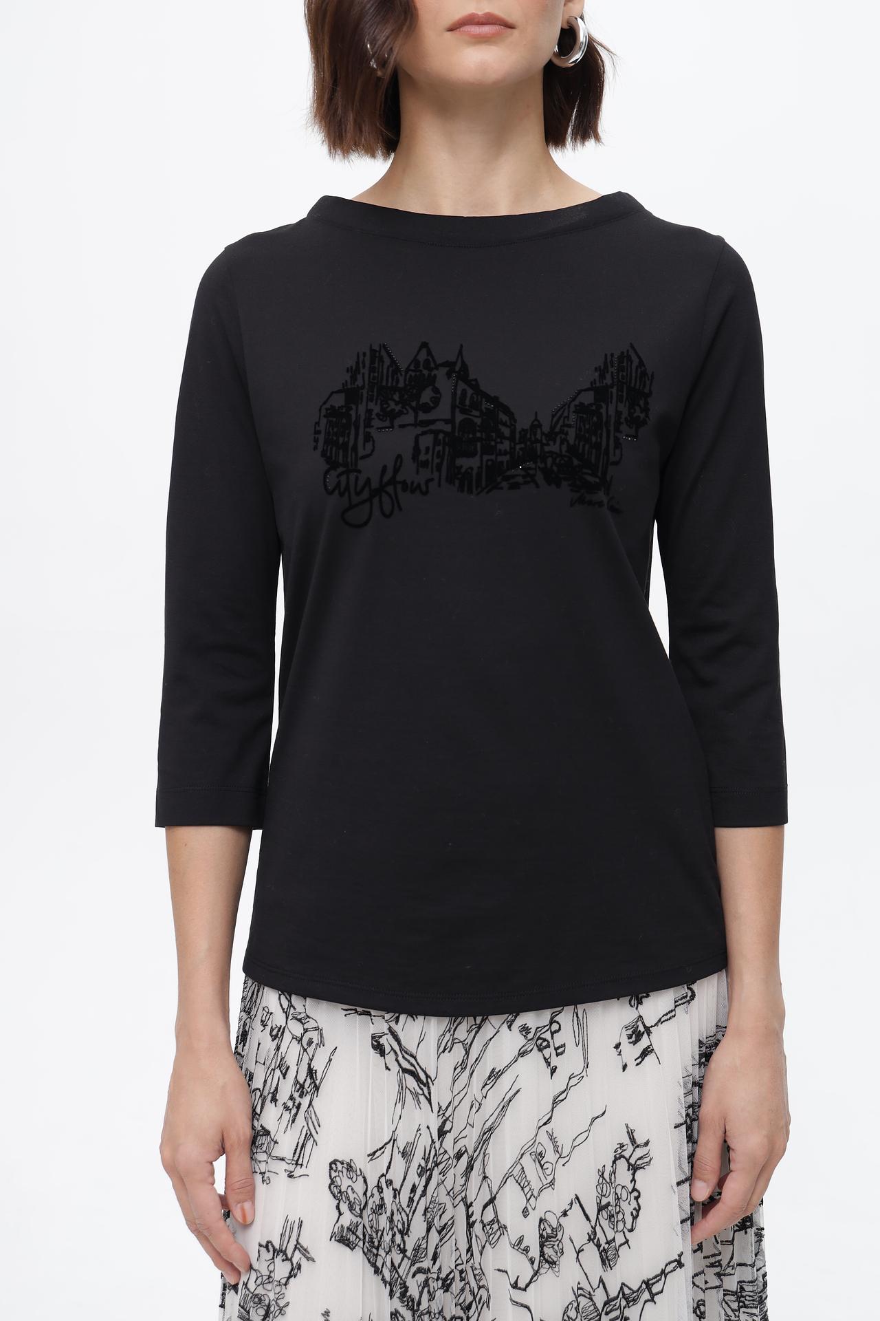 Элегантная футболка Marc Cain из 100% органического хлопка станет основой вашего стильного образа. Мягкая, дышащая ткань обеспечивает максимальный комфорт в течение всего дня. Модель с изящным принтом в урбанистическом стиле добавит утонченности любому наряду. Универсальный черный цвет и актуальный крой делают эту футболку незаменимой вещью в гардеробе современной женщины.