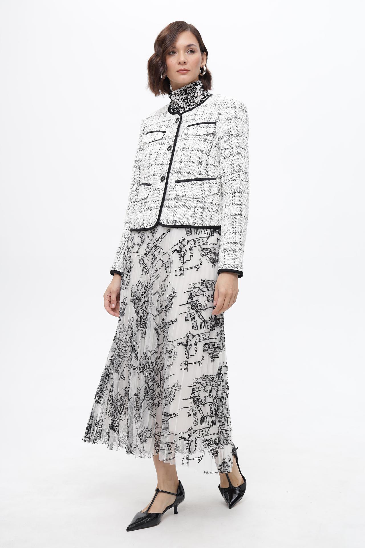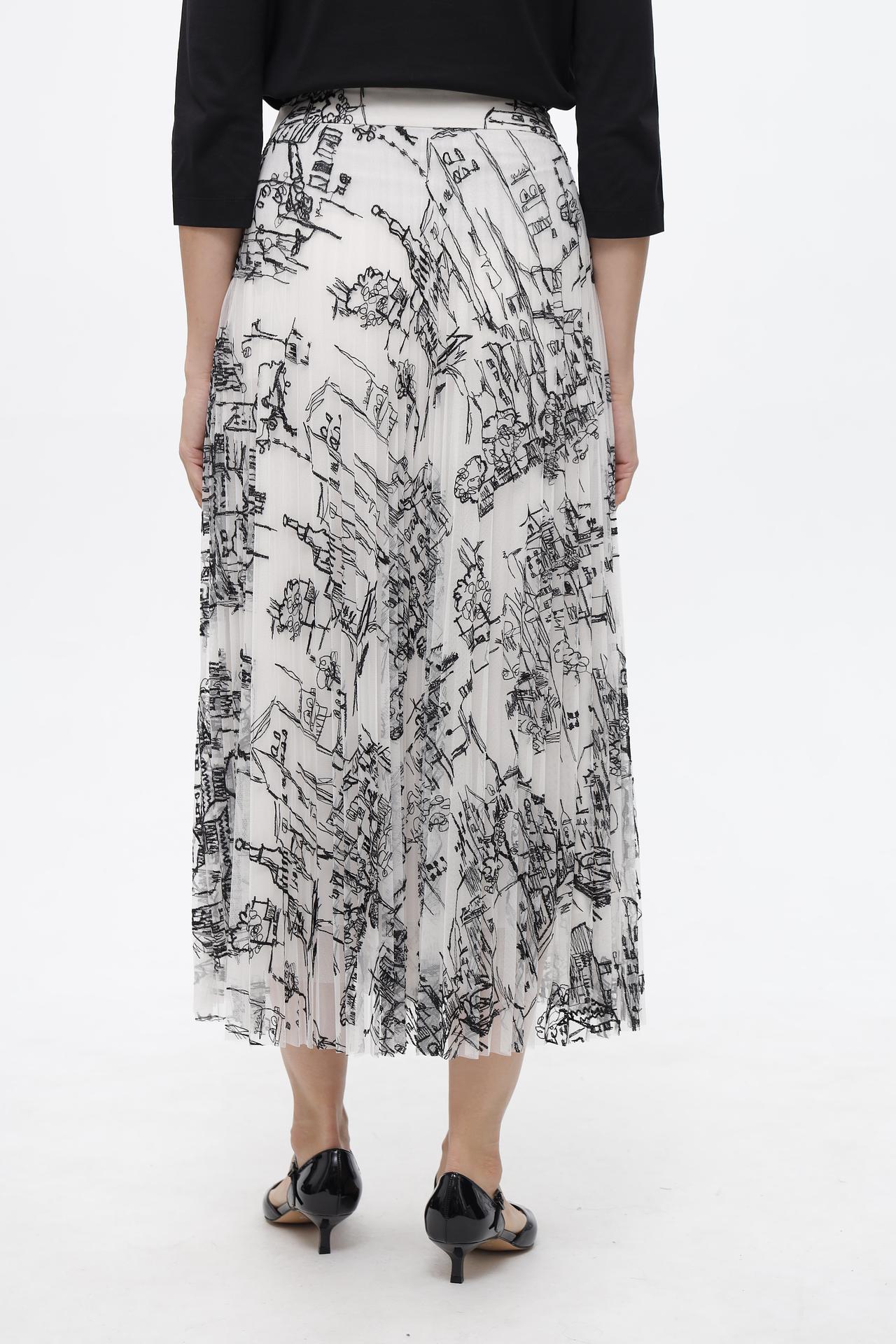 - Дизайн: Плиссированная юбка миди длины с оригинальным черно-белым принтом, имитирующим городской пейзаж. Аккуратные складки создают красивую игру объема и динамики.