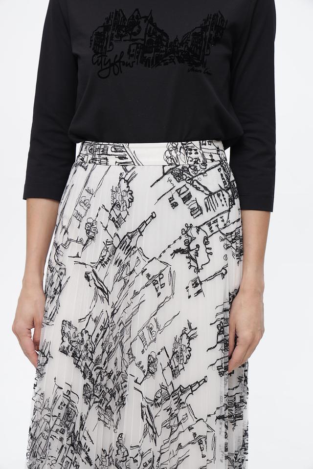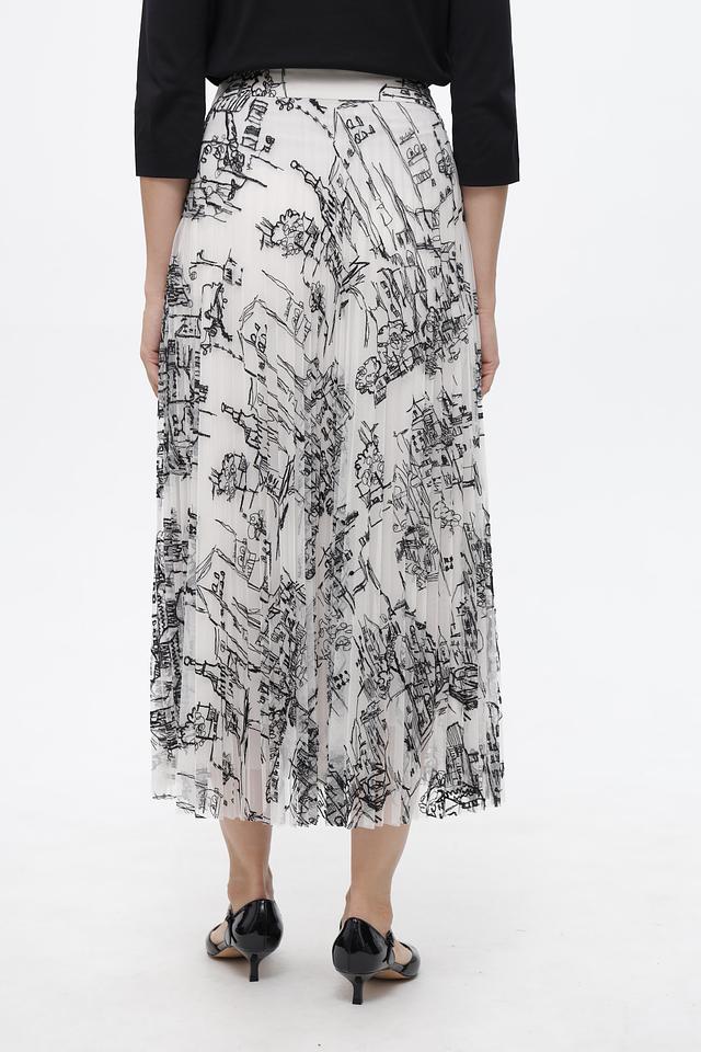 Юбка Marc Cain белого цвета с оригинальным принтом в виде городского пейзажа. Изготовлена из 100% полиэстера, модель имеет плиссированную фактуру и длину миди. Состав: полиэстер 100%