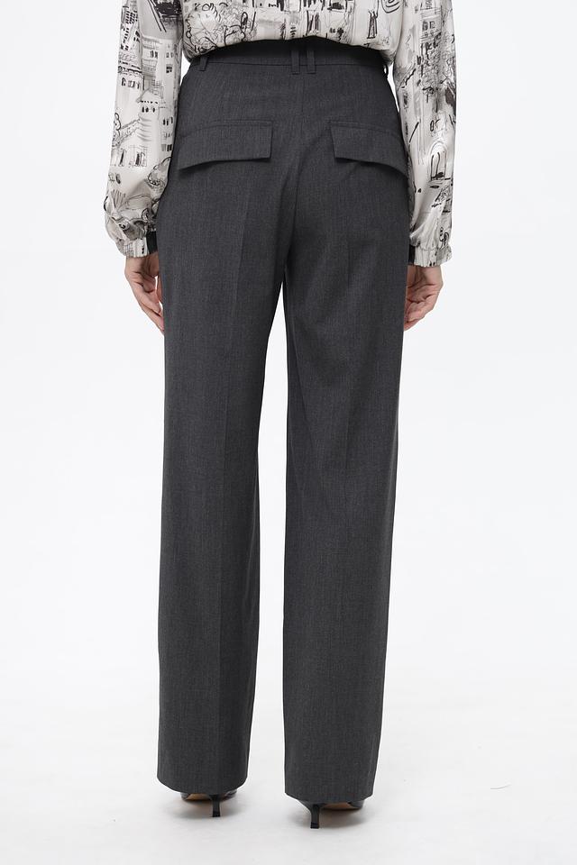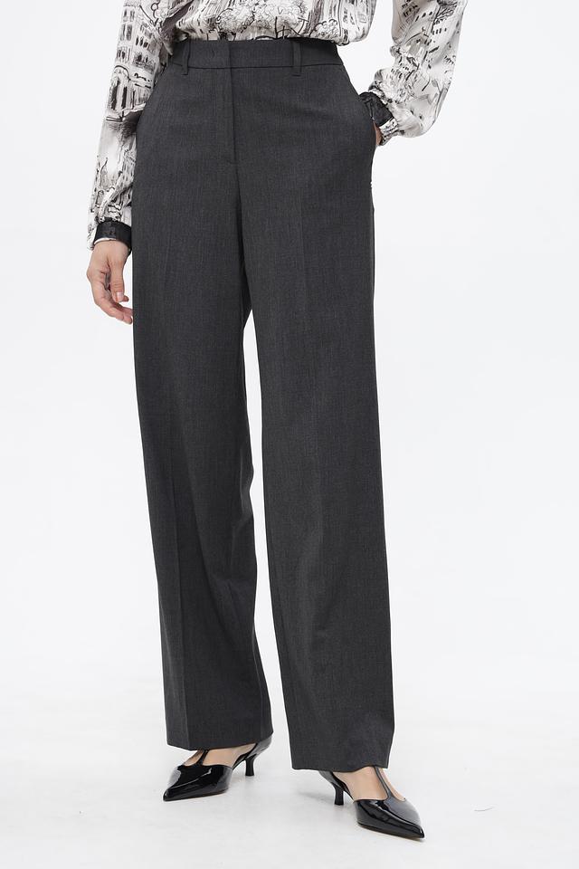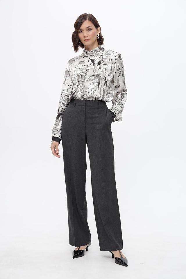 Брюки имеют прямой крой и высокую посадку, что обеспечивает комфортную посадку и подчеркивает достоинства фигуры. Застежка на молнию и пуговицу, а также боковые и задние карманы добавляют функциональности.