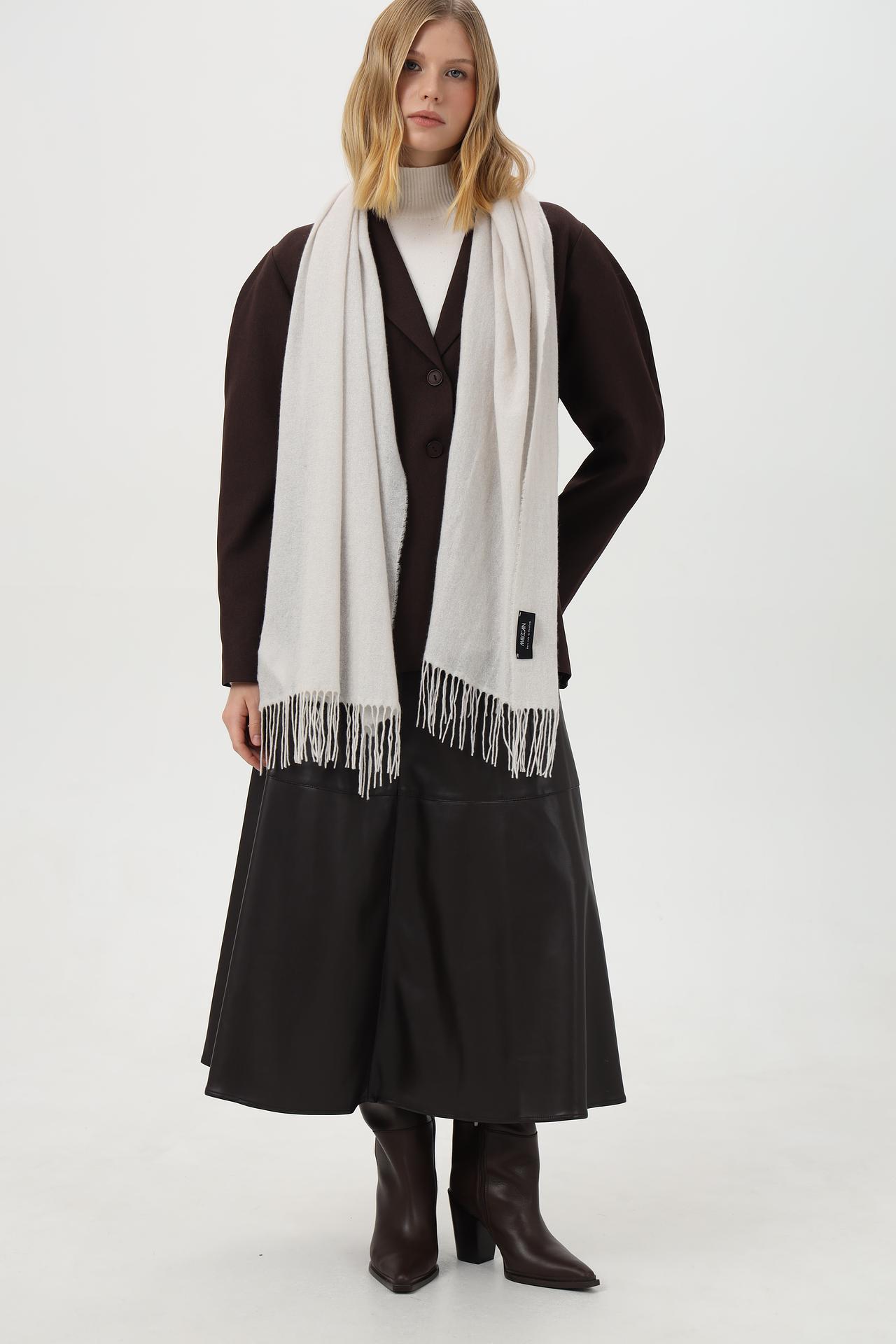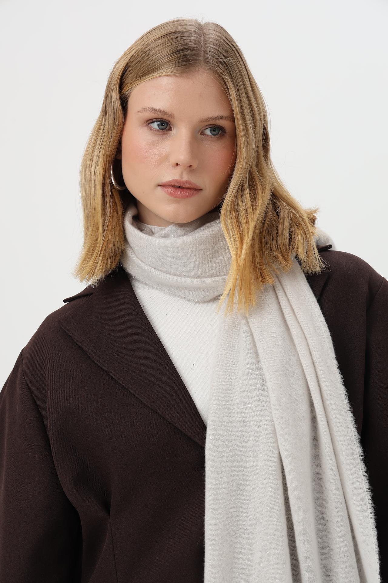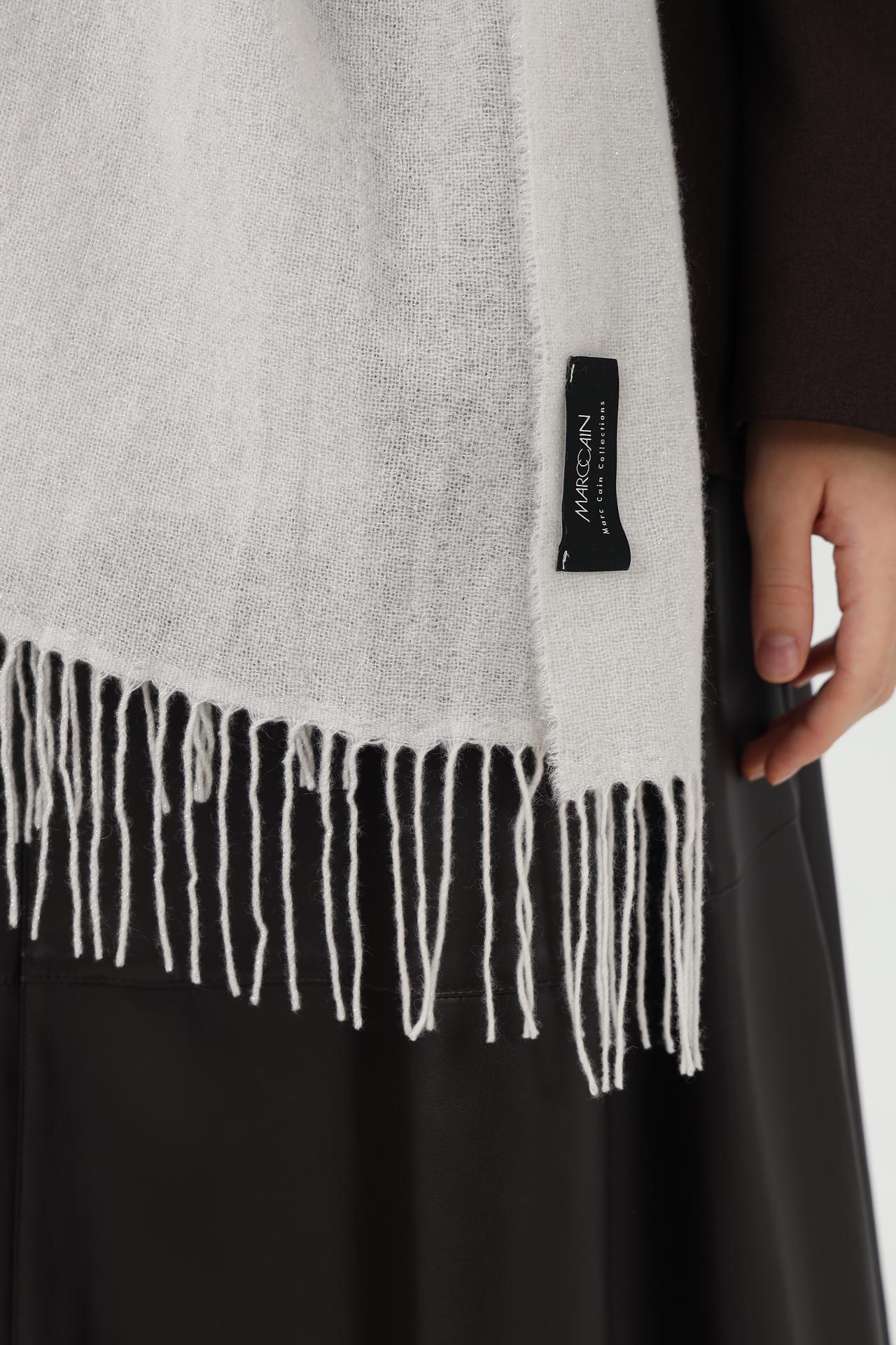 - Дизайн: Классический шарф прямого кроя с бахромой по краям. Деликатная текстура ткани и минималистичный дизайн делают его универсальным дополнением к любому наряду, от повседневного до вечернего.