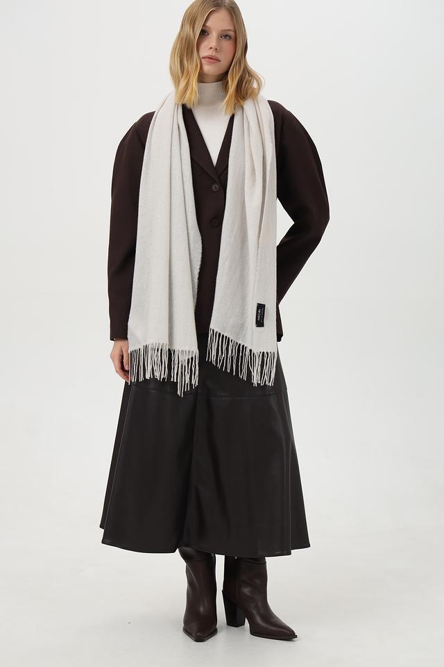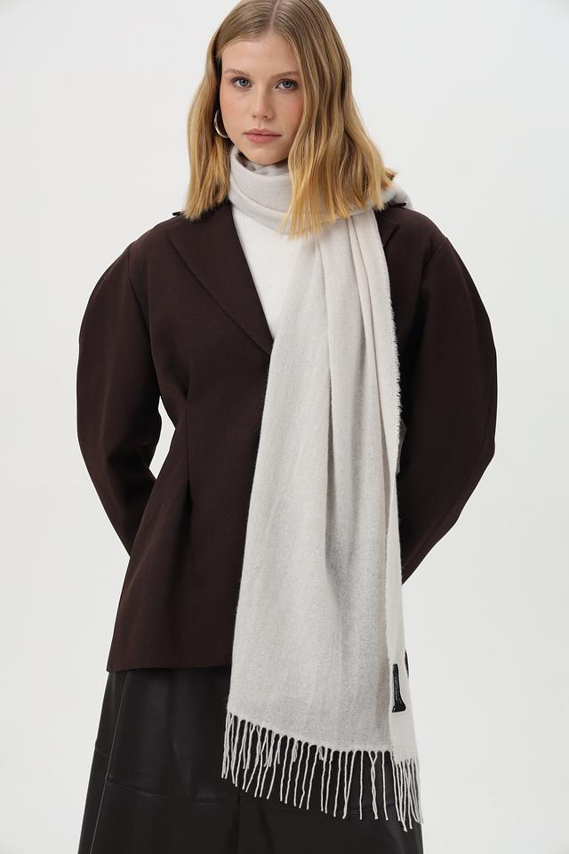 Особое внимание привлекает деликатная бахрома по краям шарфа, придающая ему изысканный и стильный вид. На шарфе присутствует небольшой логотип бренда, подчеркивающий его премиальность. Этот шарф станет отличным подарком для себя или близких.