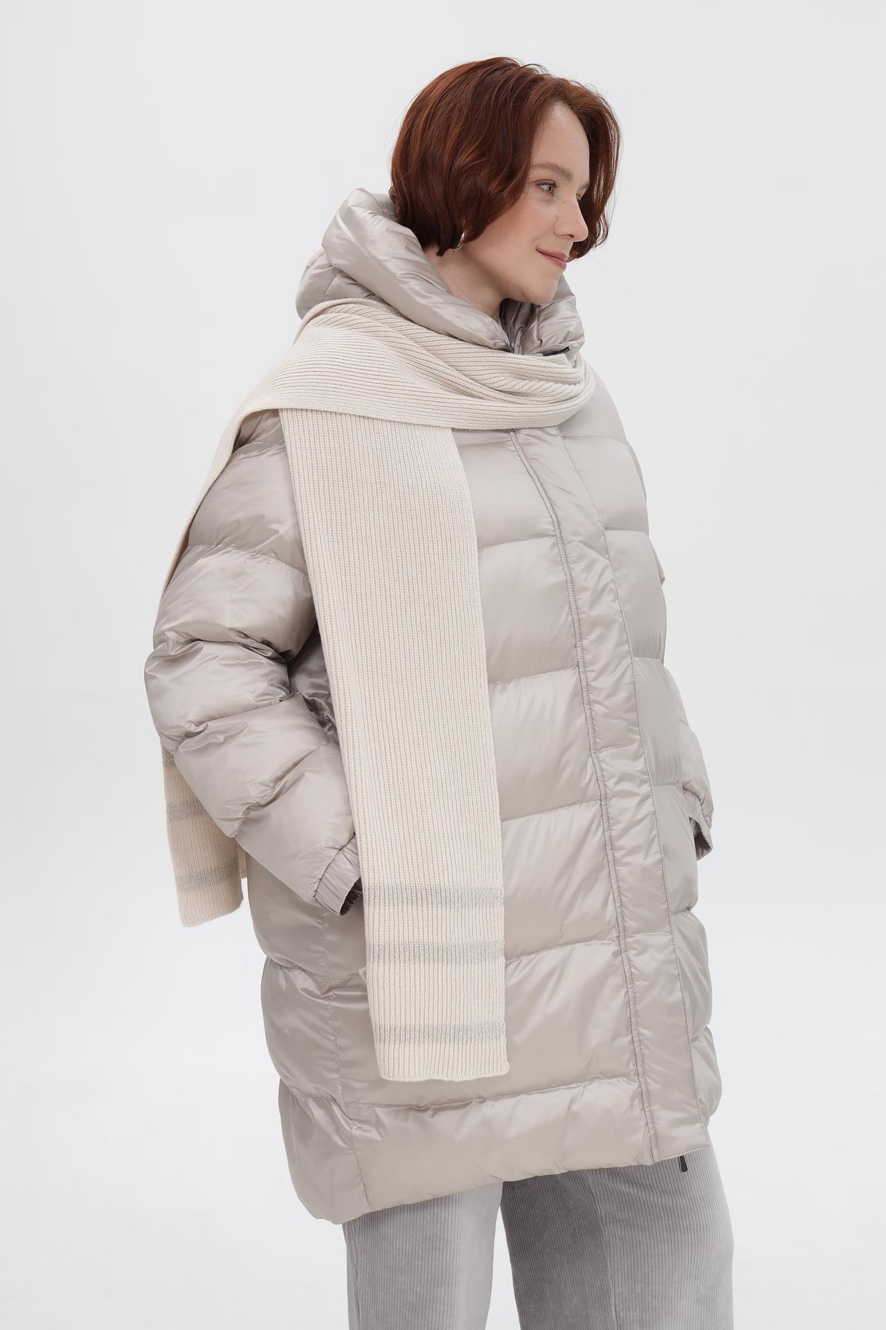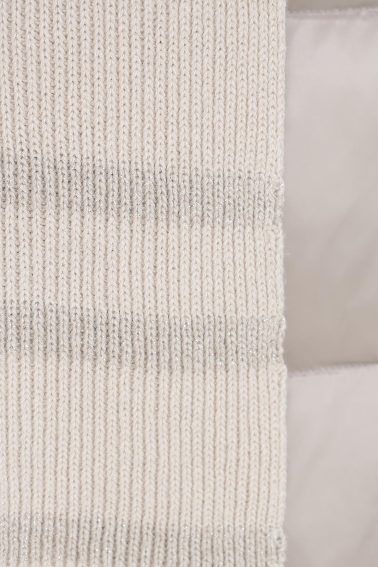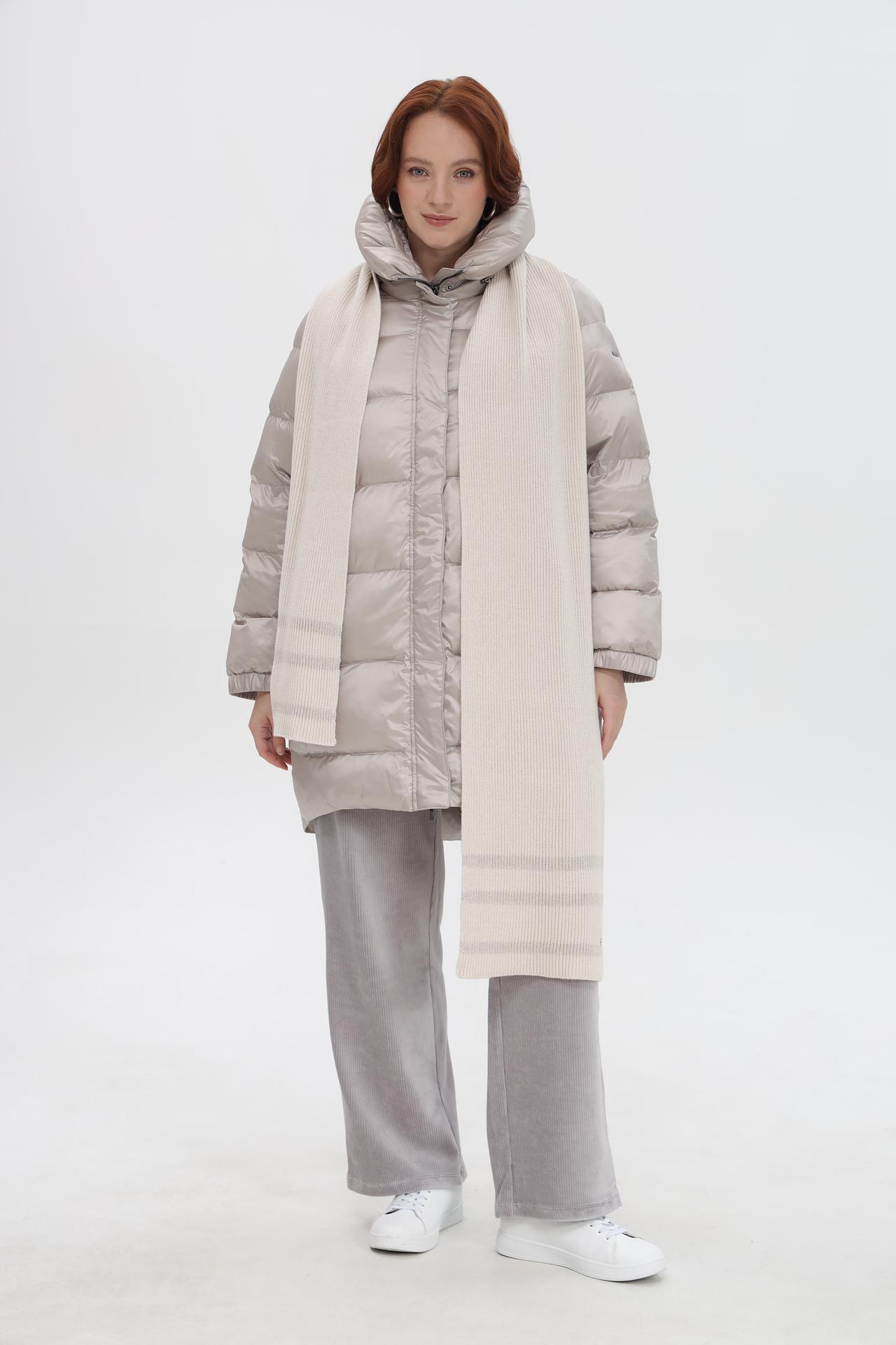 - Дизайн: Классический шарф в рубчик с деликатными горизонтальными полосами, включающими метализированную нить, добавляет изысканности.