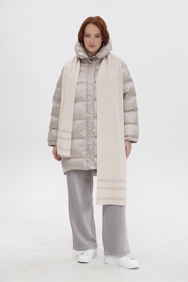 Шарф выполнен в бежевом цвете, с классической полосатой текстурой. Он изготовлен из высококачественной смеси материалов: шерсти, кашемира, вискозы и полиамида с добавлением метализированной нити, что придает изделию деликатный блеск.