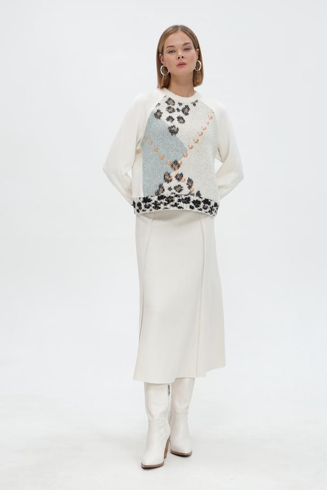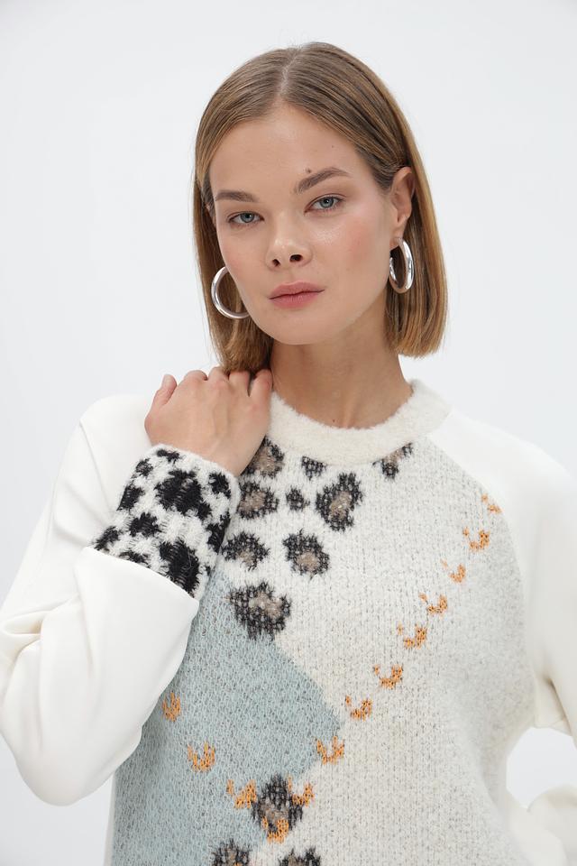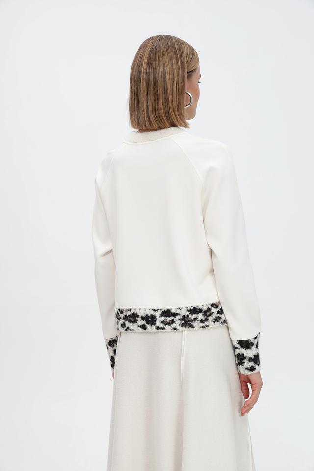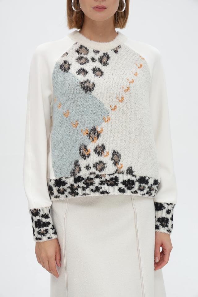 Представляем стильный пуловер от бренда Marc Cain. Модель выполнена в белом цвете и отличается необычным дизайном – сочетанием однотонных рукавов и центральной части с ярким леопардовым принтом.