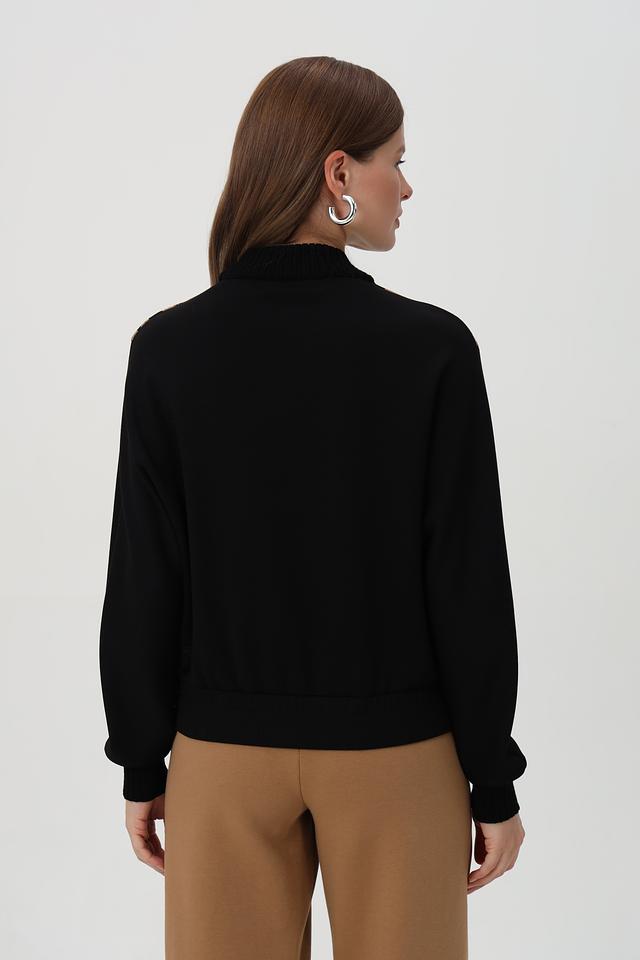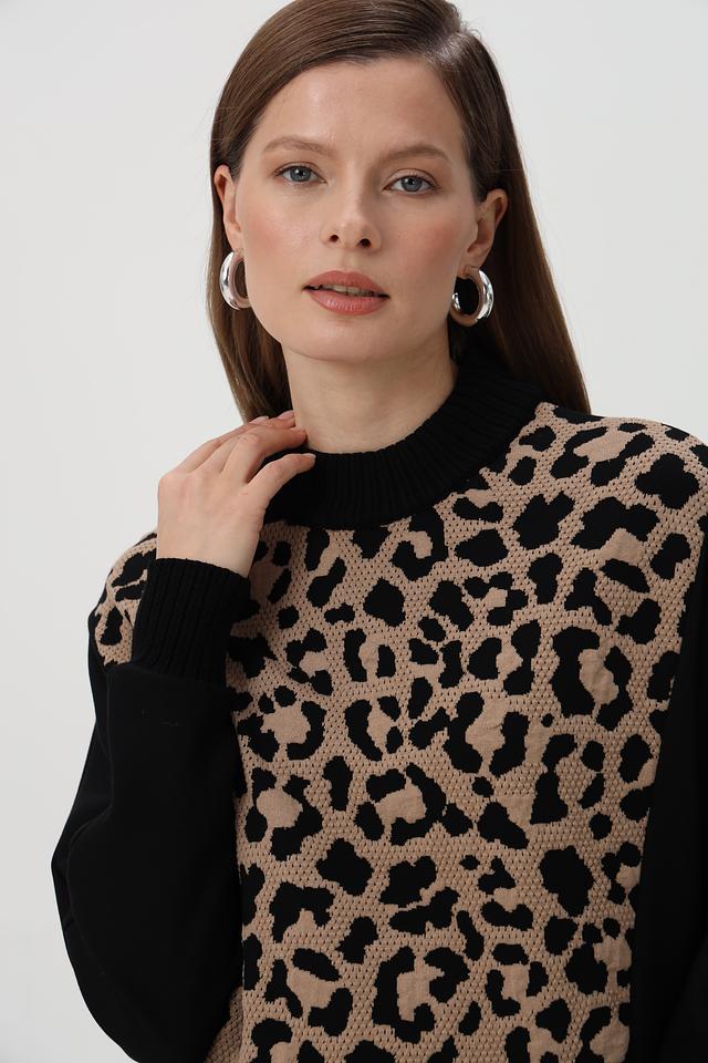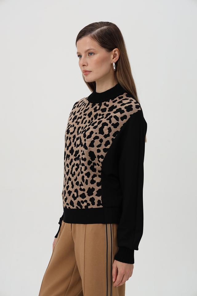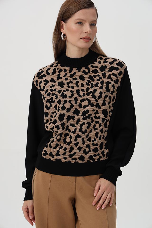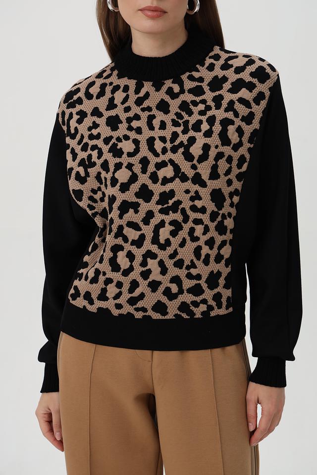 Элегантный пуловер от Marc Cain Sports, выполненный в чёрном цвете с эффектным леопардовым принтом на передней части. Модель имеет классический крой с высоким воротом-стойкой, что придает ей изысканность.