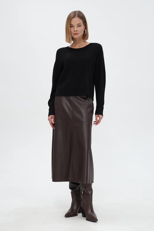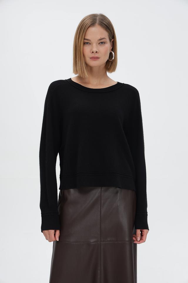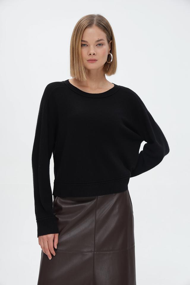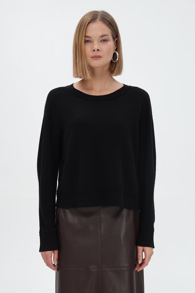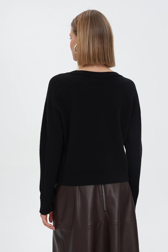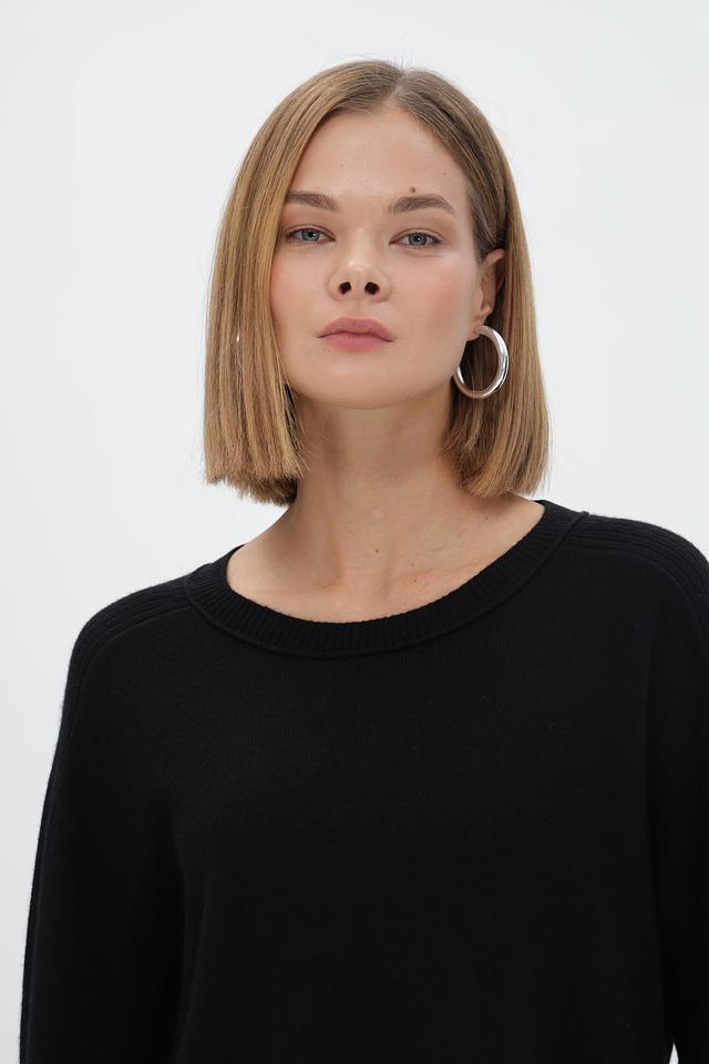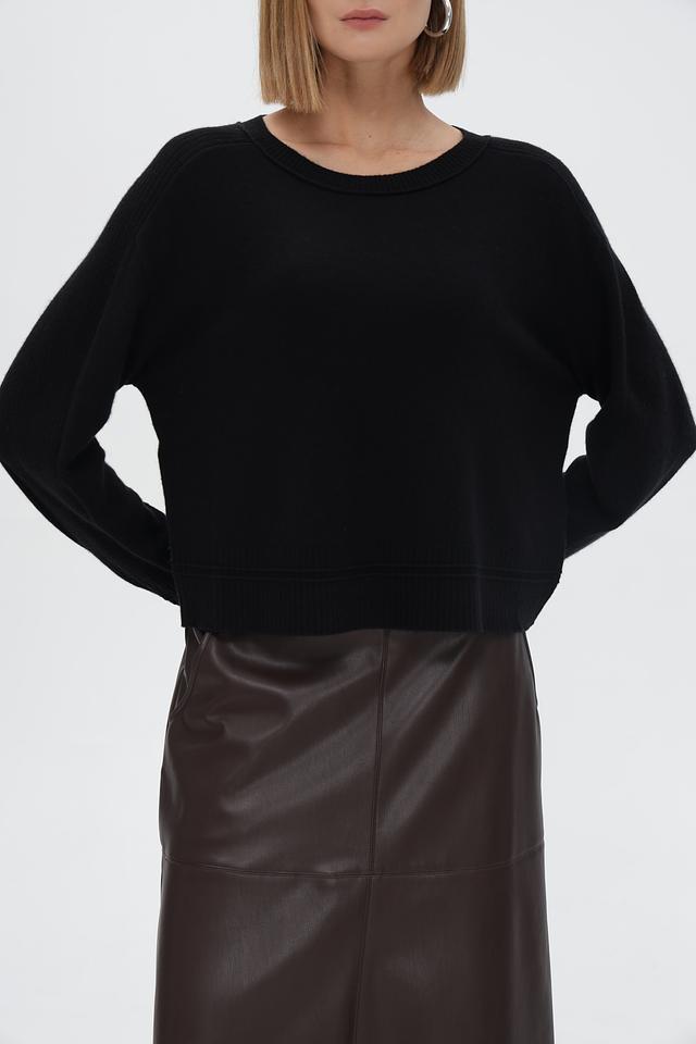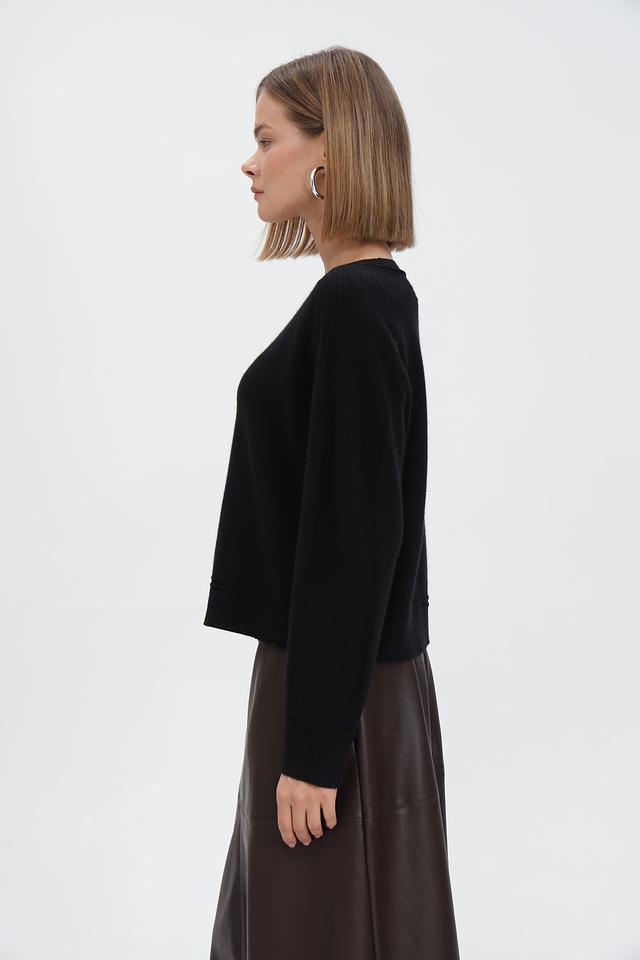Пуловер имеет классический чёрный цвет, который легко сочетается с любой одеждой. Круглый вырез горловины и длинные рукава обеспечивают удобную посадку. Резинки на рукавах и по низу изделия подчеркивают силуэт и создают аккуратный вид.