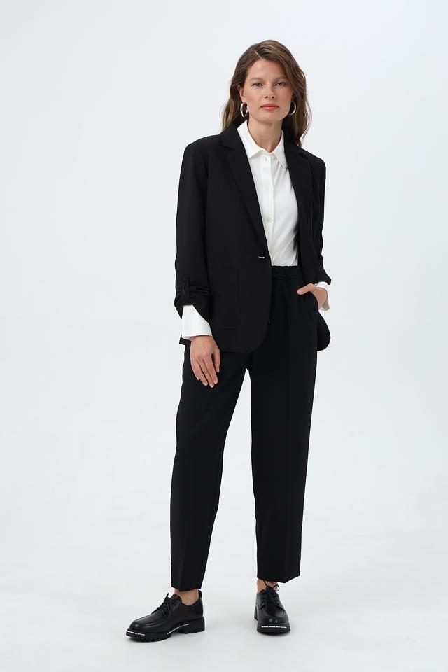 Брюки имеют прямой крой и укороченную длину, что делает их идеальным выбором для создания современных и стильных образов. Эластичный пояс на кулиске обеспечивает удобную посадку и позволяет регулировать степень прилегания.