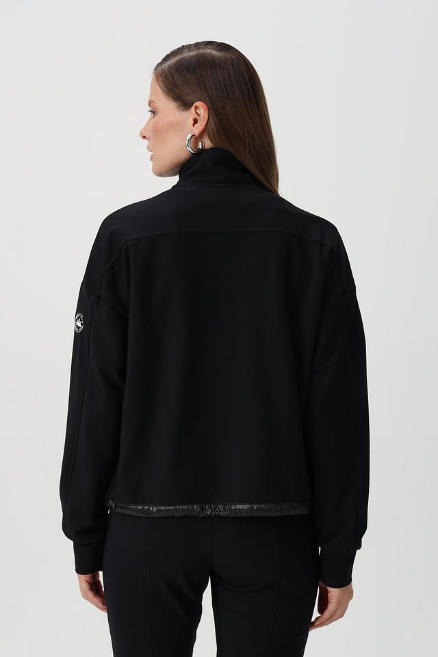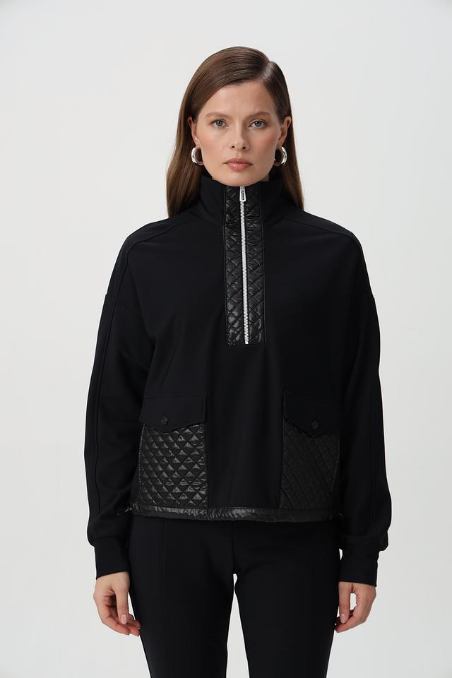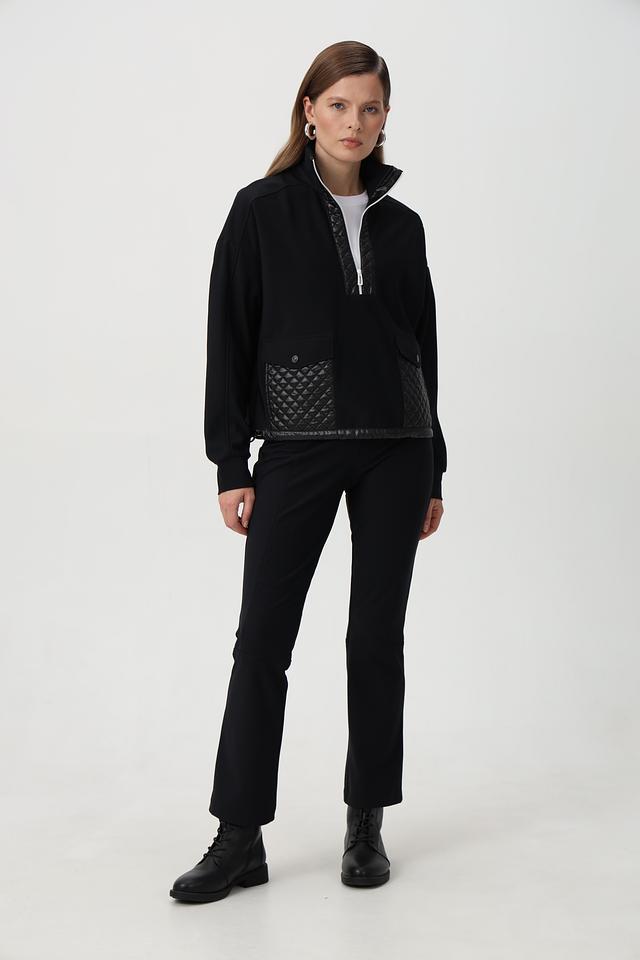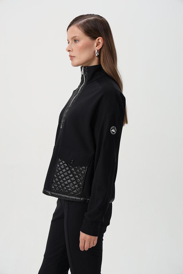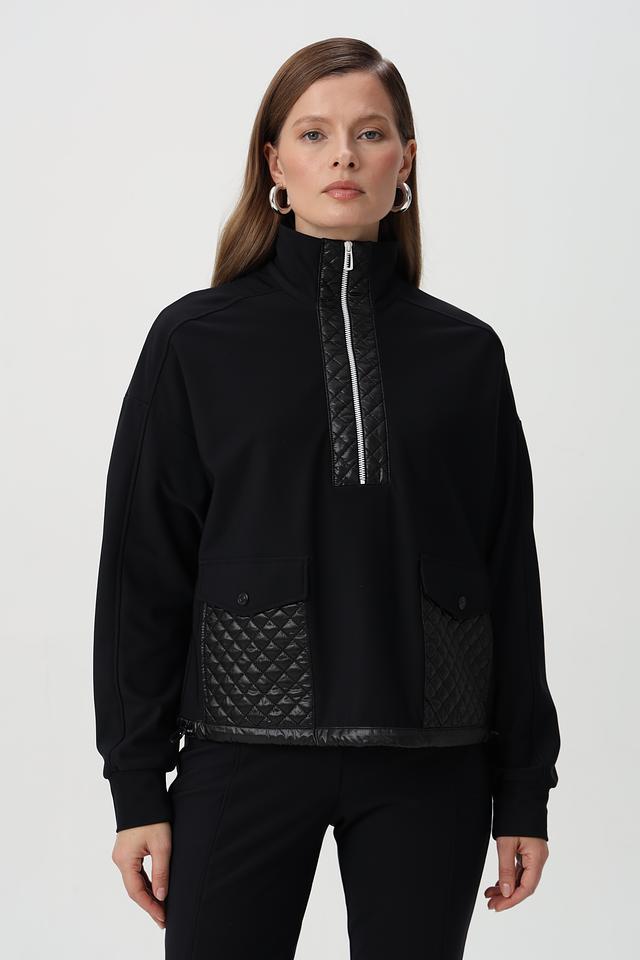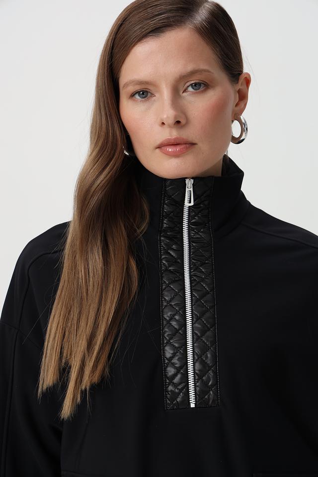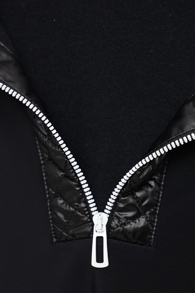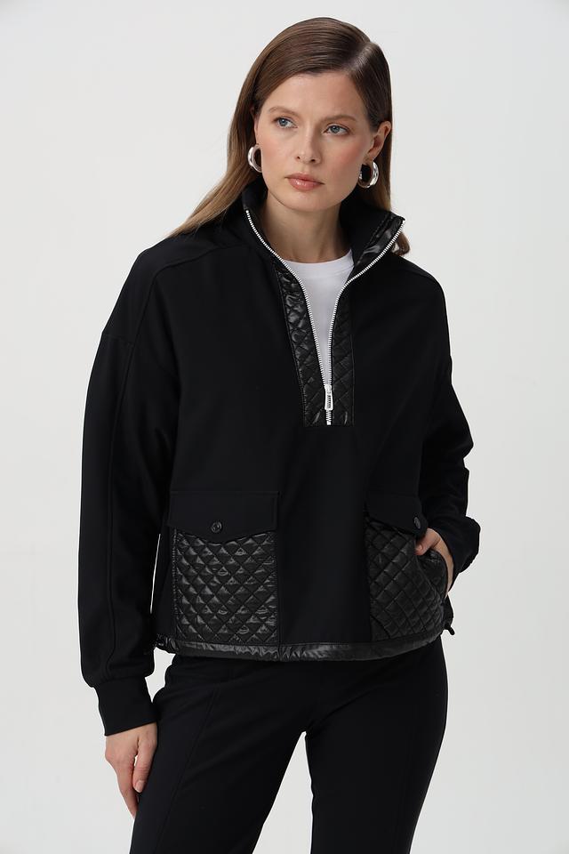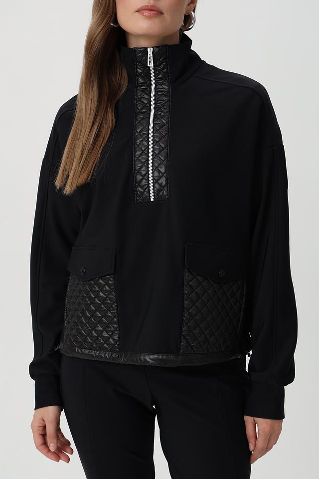 Пуловер имеет воротник-стойку и молнию, которая частично застегивается. Дизайн дополнен стегаными вставками из глянцевой ткани на плечах, груди и рукавах, придающими модели современный вид.