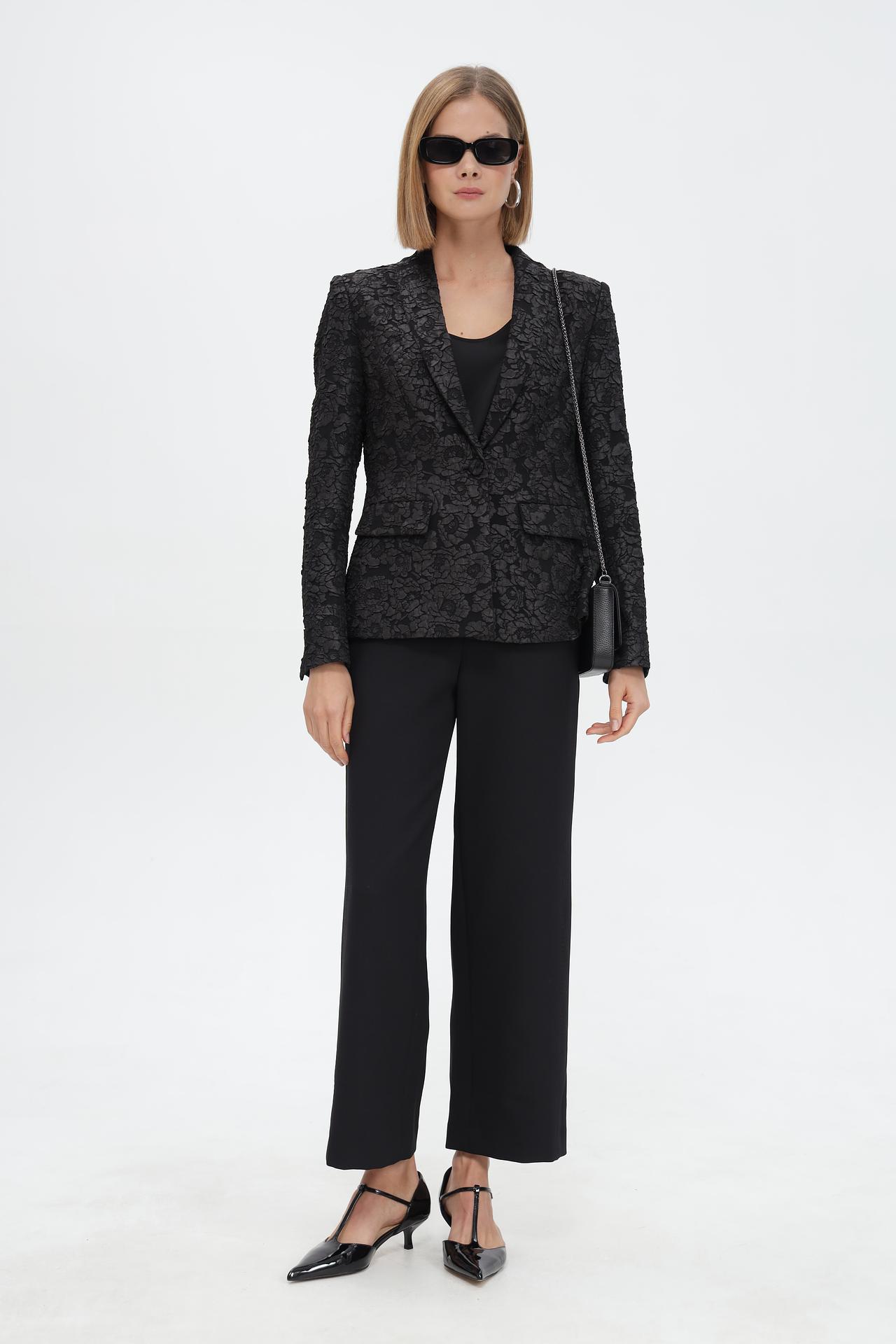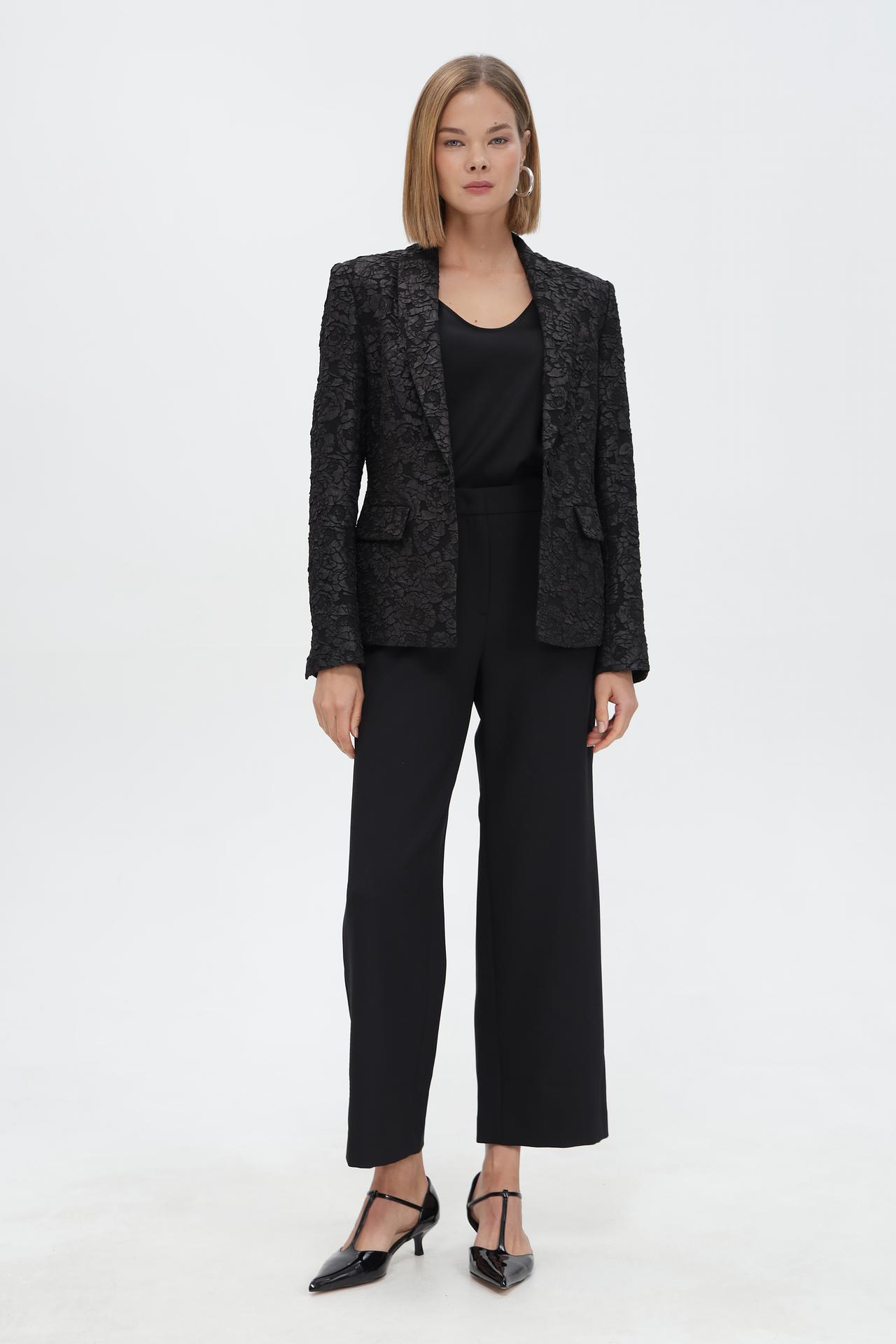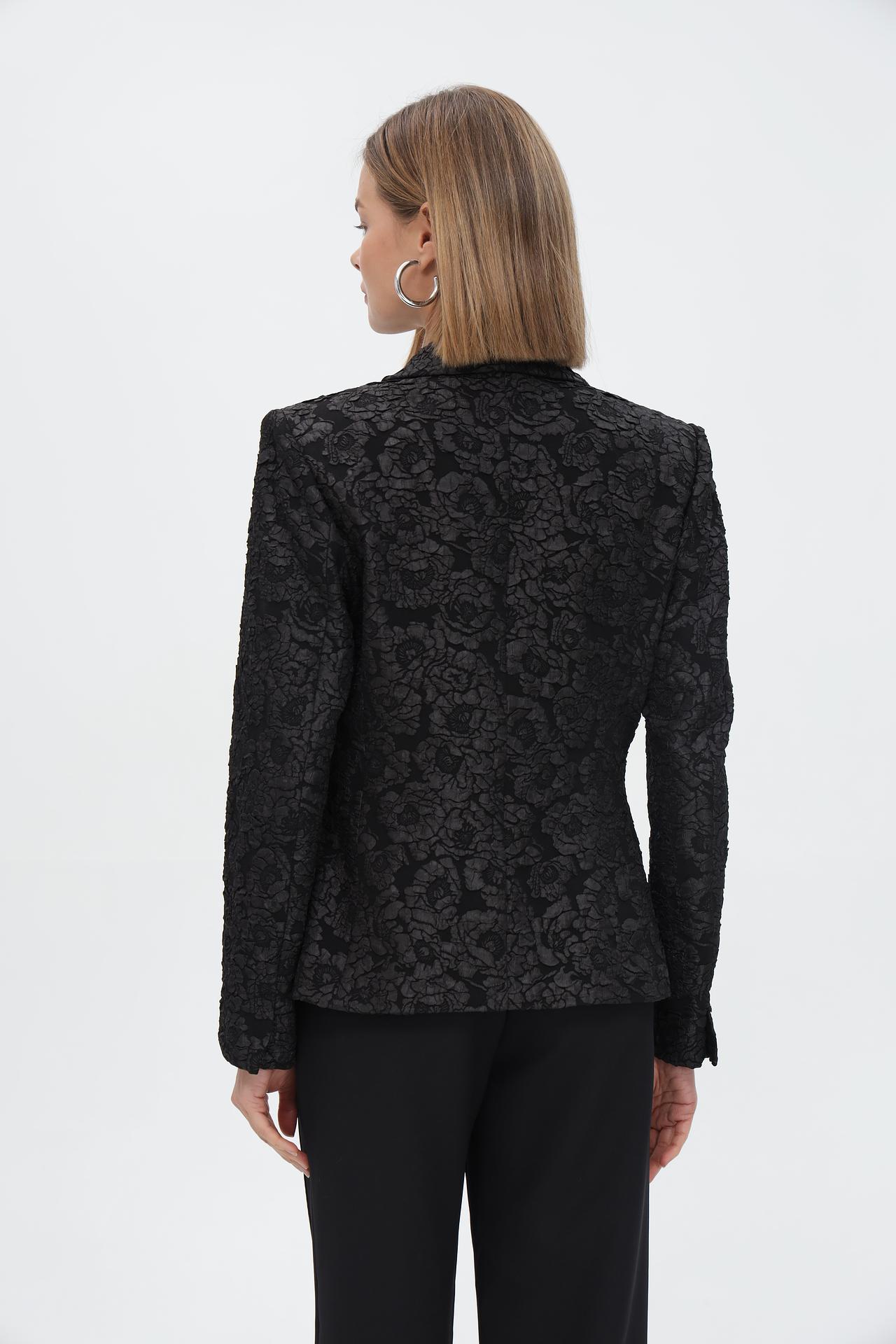 - Дизайн: Классический крой с V-образным вырезом и однобортной застежкой. Рельефный цветочный принт придает жакету уникальность.