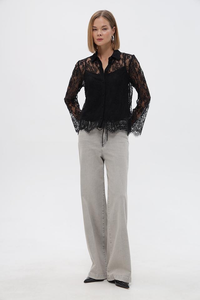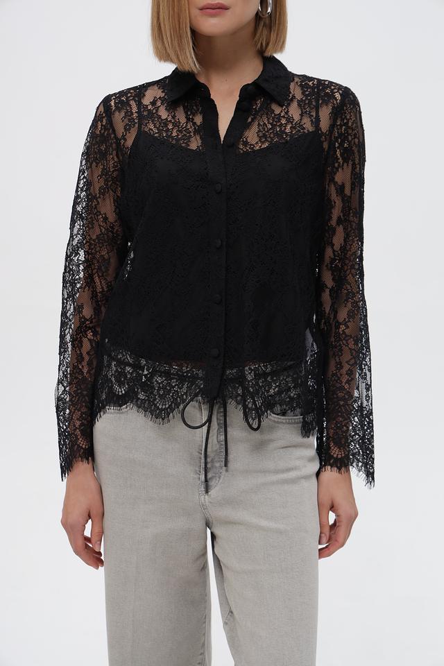 Блузка застегивается на ряд пуговиц по всей длине. Полупрозрачная текстура кружева придает образу легкость и женственность. Модель отлично сочетается с юбками, брюками и джинсами.