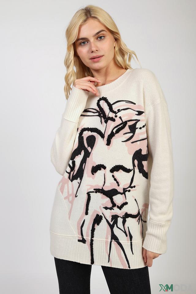 Пуловер имеет свободный крой, который не сковывает движений и позволяет создать расслабленный, но элегантный силуэт. Основной цвет изделия – бежевый, который служит идеальным фоном для выразительного принта.
