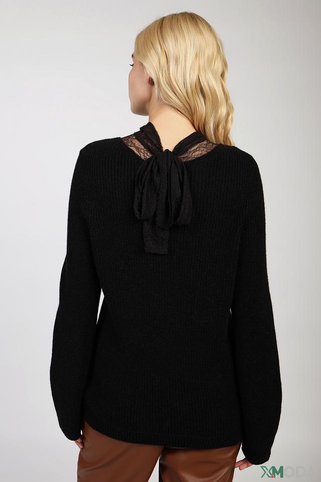 Пуловер имеет классический чёрный цвет и свободный крой, который позволяет создать непринужденный и элегантный образ. V-образный вырез декорирован изысканным кружевом, добавляющим женственности и утонченности.
