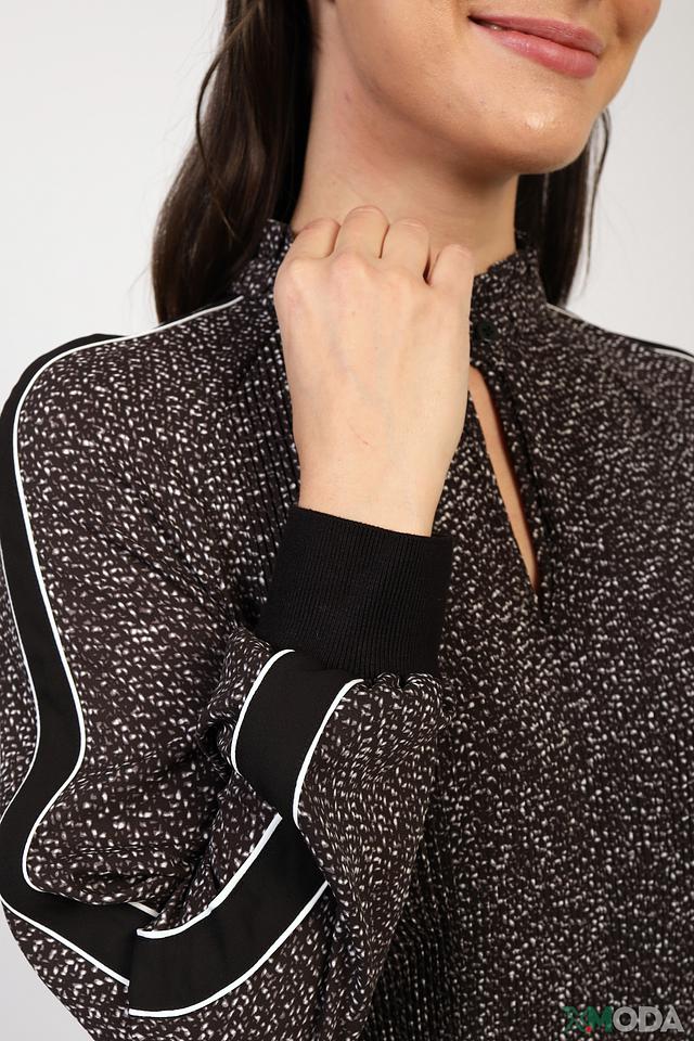 Платье Marc Cain чёрного цвета с мелким принтом и плиссированной юбкой. Модель имеет рукава 3/4 с контрастной белой полосой и небольшой вырез горловины. Состав: полиэстер 100%, Состав_отделка вискоза 88%, Состав_подкладка полиэстер 85%, Состав_подкладка эластан 15%, Состав_отделка эластан 12%